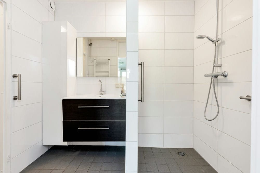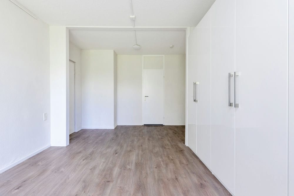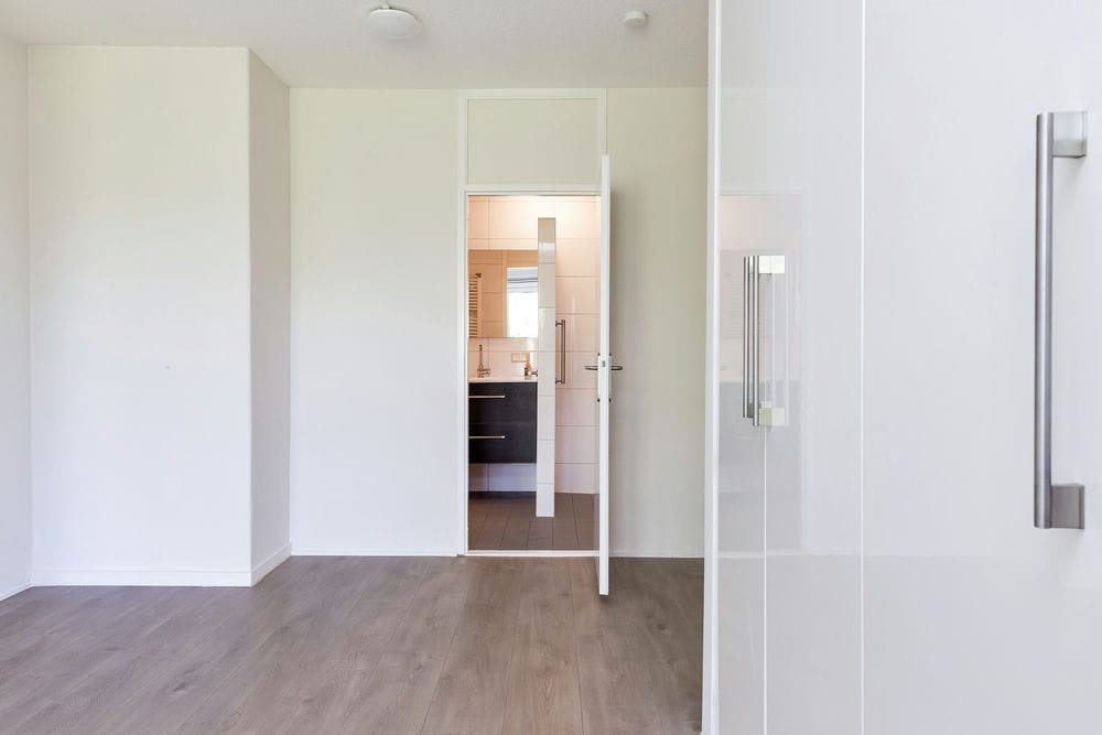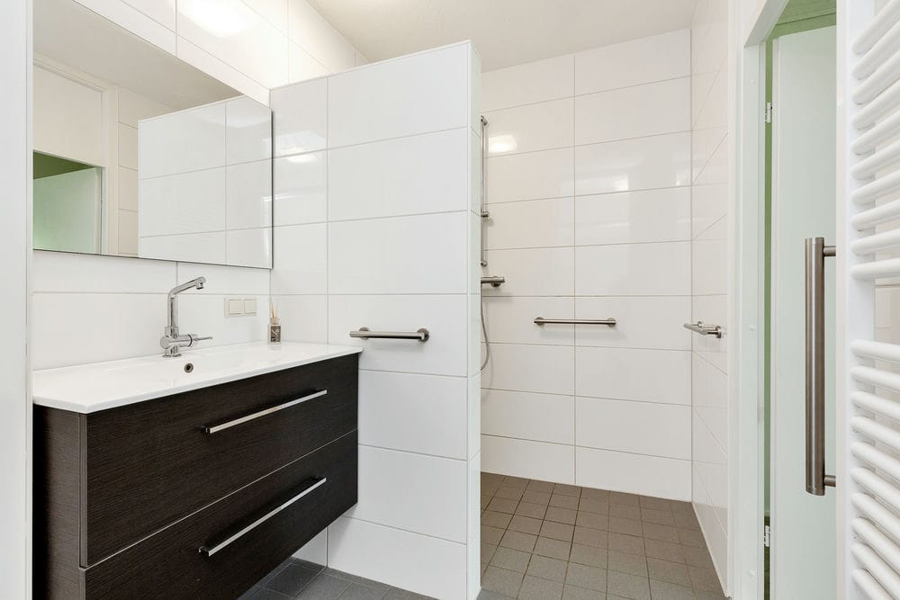 De ruime, lichte woonkamer is strak en modern afgewerkt in een lichte kleurstelling, met een mooie laminaatvloer. De woning beschikt over een zeer ruime slaapkamer met en suite toegang tot de badkamer, die is uitgerust met een toilet, bidet, wastafel met meubel en inloopdouche.