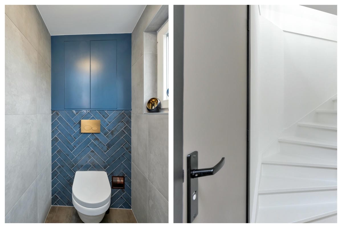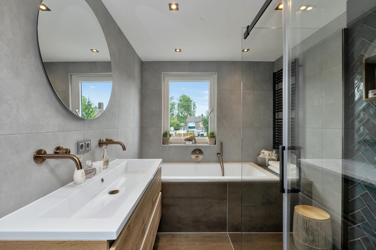 Eerste verdieping: twee slaapkamers, apart toilet met wasmachineaansluiting, luxe badkamer met vloerverwarming, ligbad, inloopdouche, dubbel wastafelmeubel en designradiator.