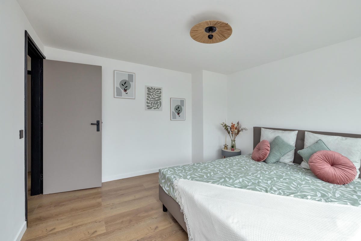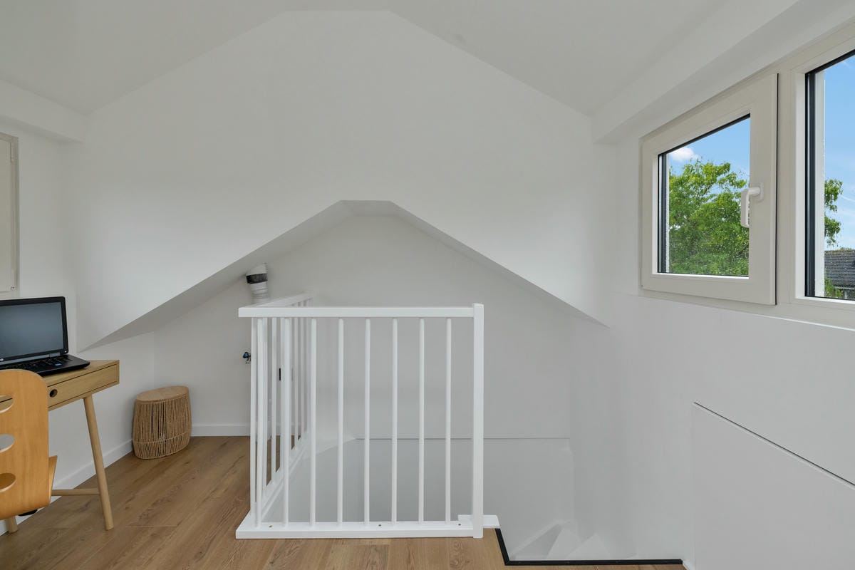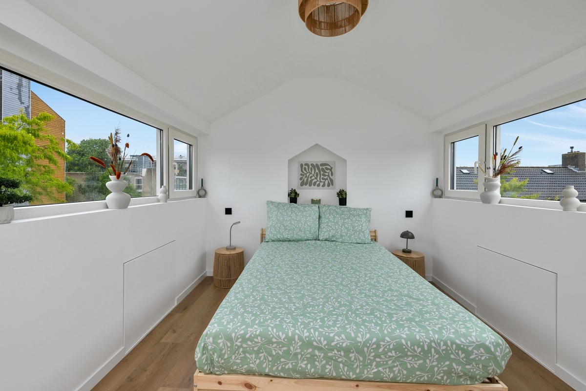 Tweede verdieping: ruime en lichte slaapkamer dankzij de dakopbouw met verhoogde nok en vaste trap.