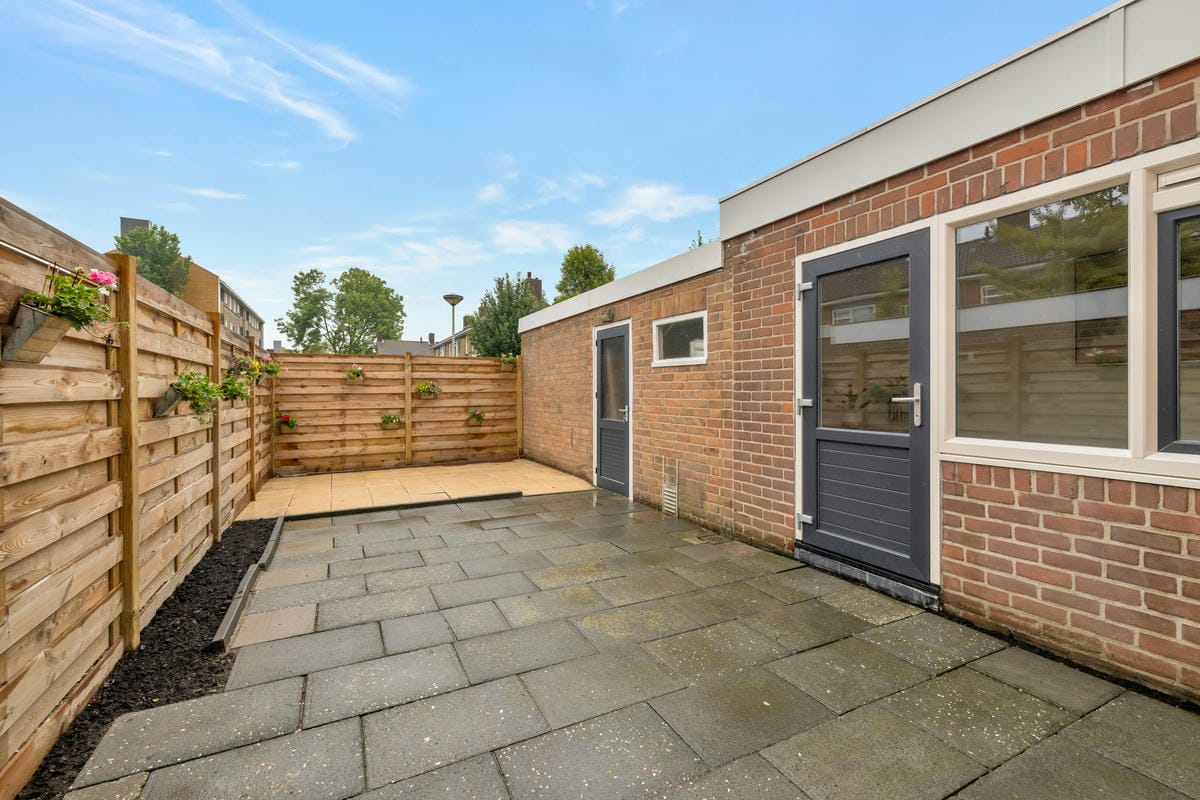 De achtertuin – gelegen op het noordoosten – is circa 9 meter diep en biedt dankzij het ontbreken van directe achterburen veel privacy. Je hebt een eigen achterom en toegang tot een stenen berging met cv-opstelling.