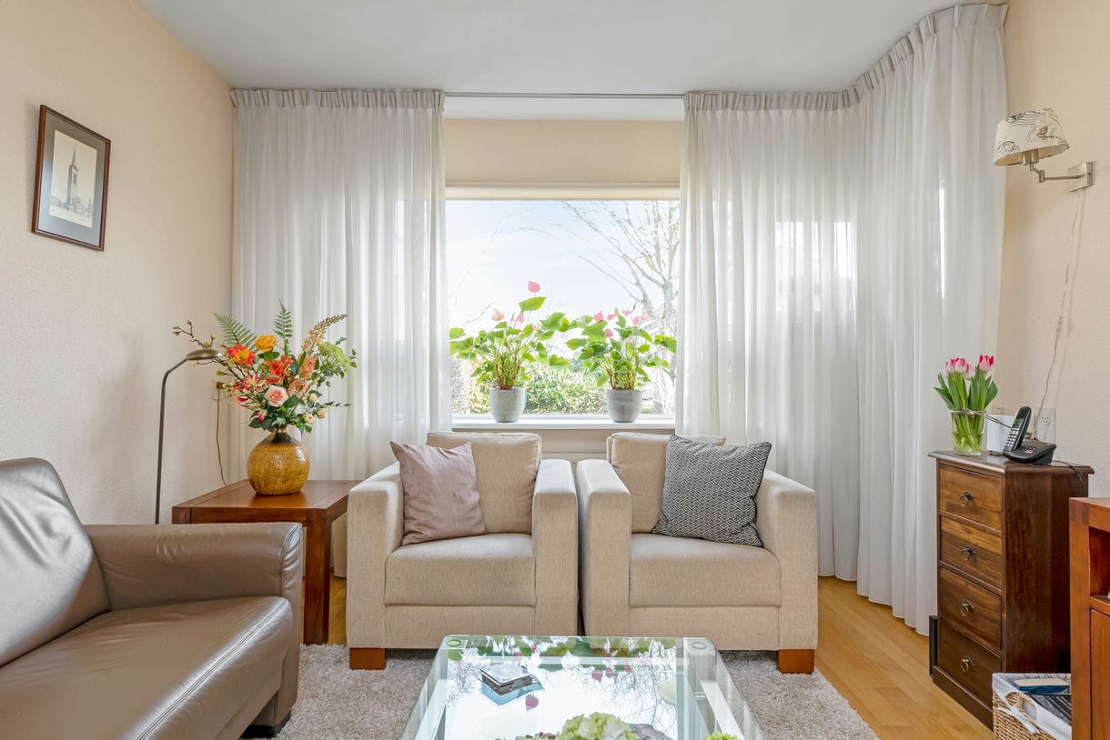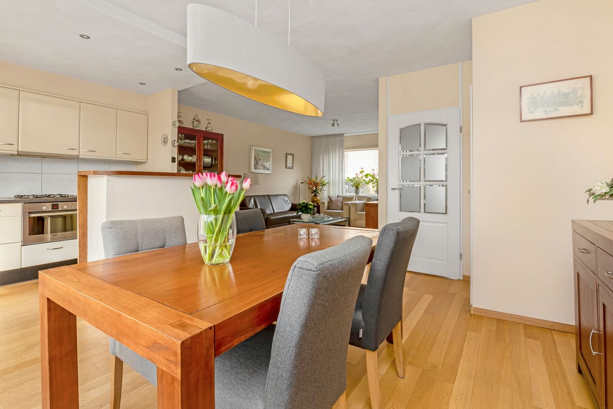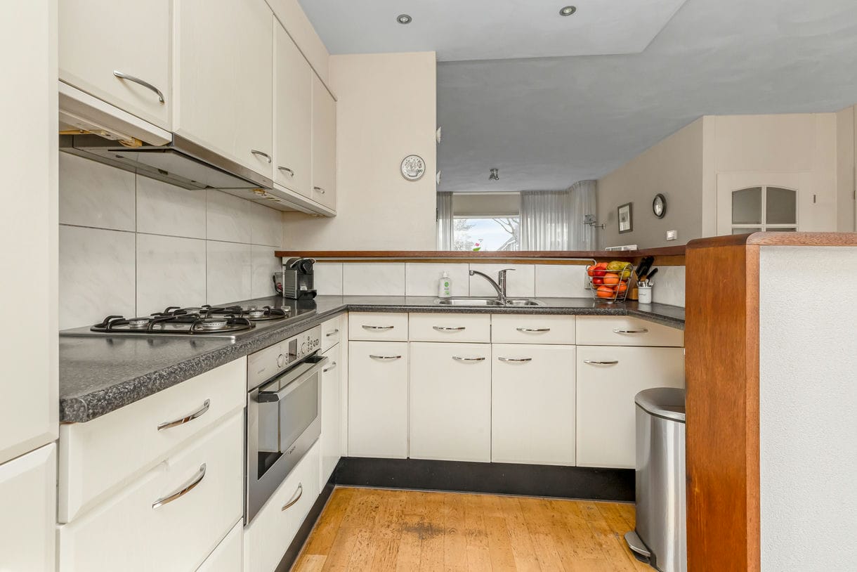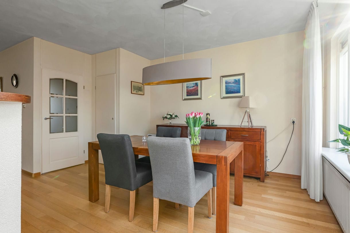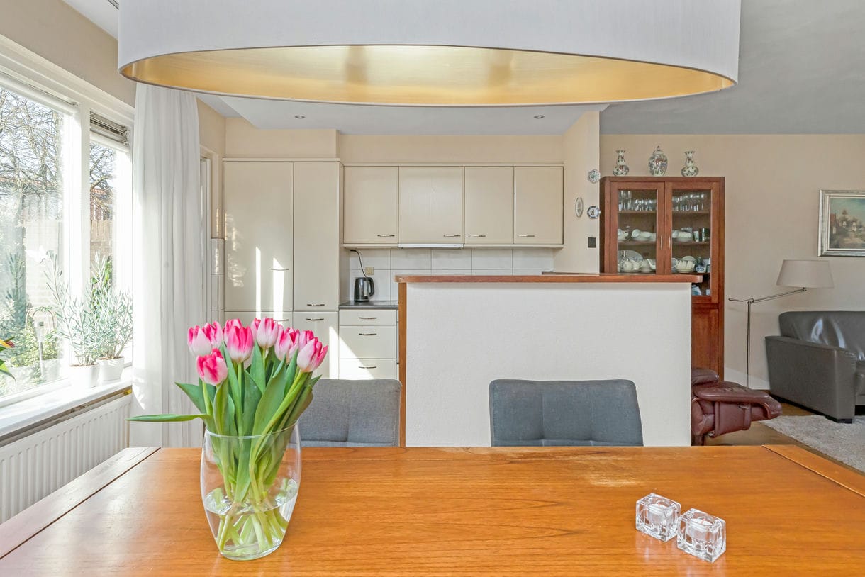 De gezellige woon-eetkamer heeft veel lichtinval door de grote raampartijen aan de voor- en achterzijde van de woning. Hierdoor komt er veel natuurlijk licht naar binnen en ontstaat een ruimtelijk gevoel. Op de gehele begane grond ligt een parketvloer, het plafond is afgewerkt met geveegd stucwerk. Via de keuken heeft u toegang tot de achtertuin, waar u heerlijk kunt genieten van de zon en het buitenleven.