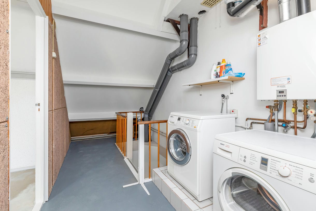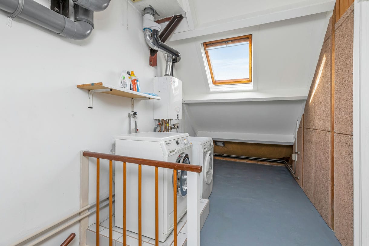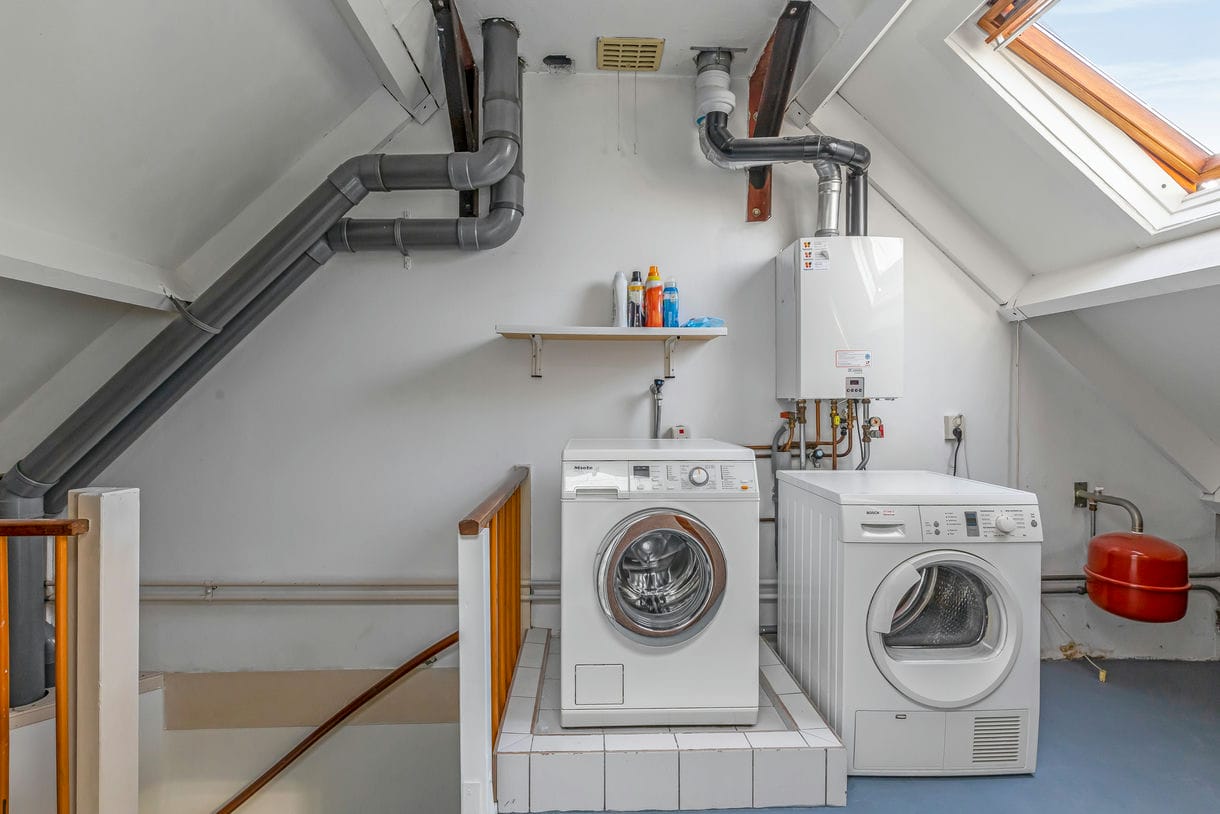Tweede verdieping: (bereikbaar via een vaste trap): Overloop met CV installatie en wasmachine-opstelling, dakraam, ruime lichte slaapkamer met dakkapel en praktische knieschotten voor extra berging, bergvliering.