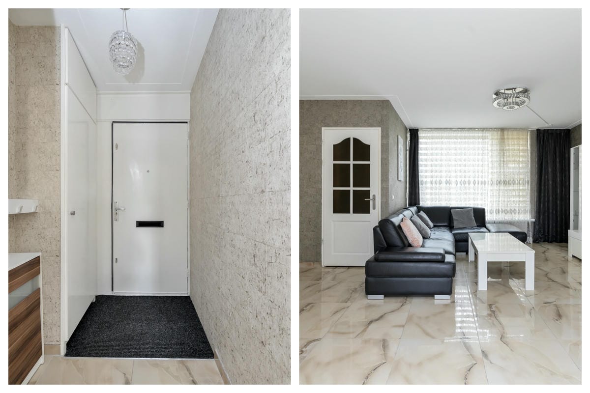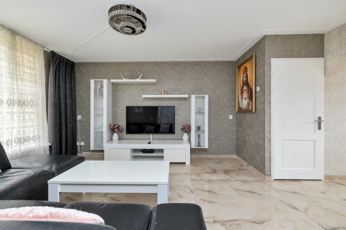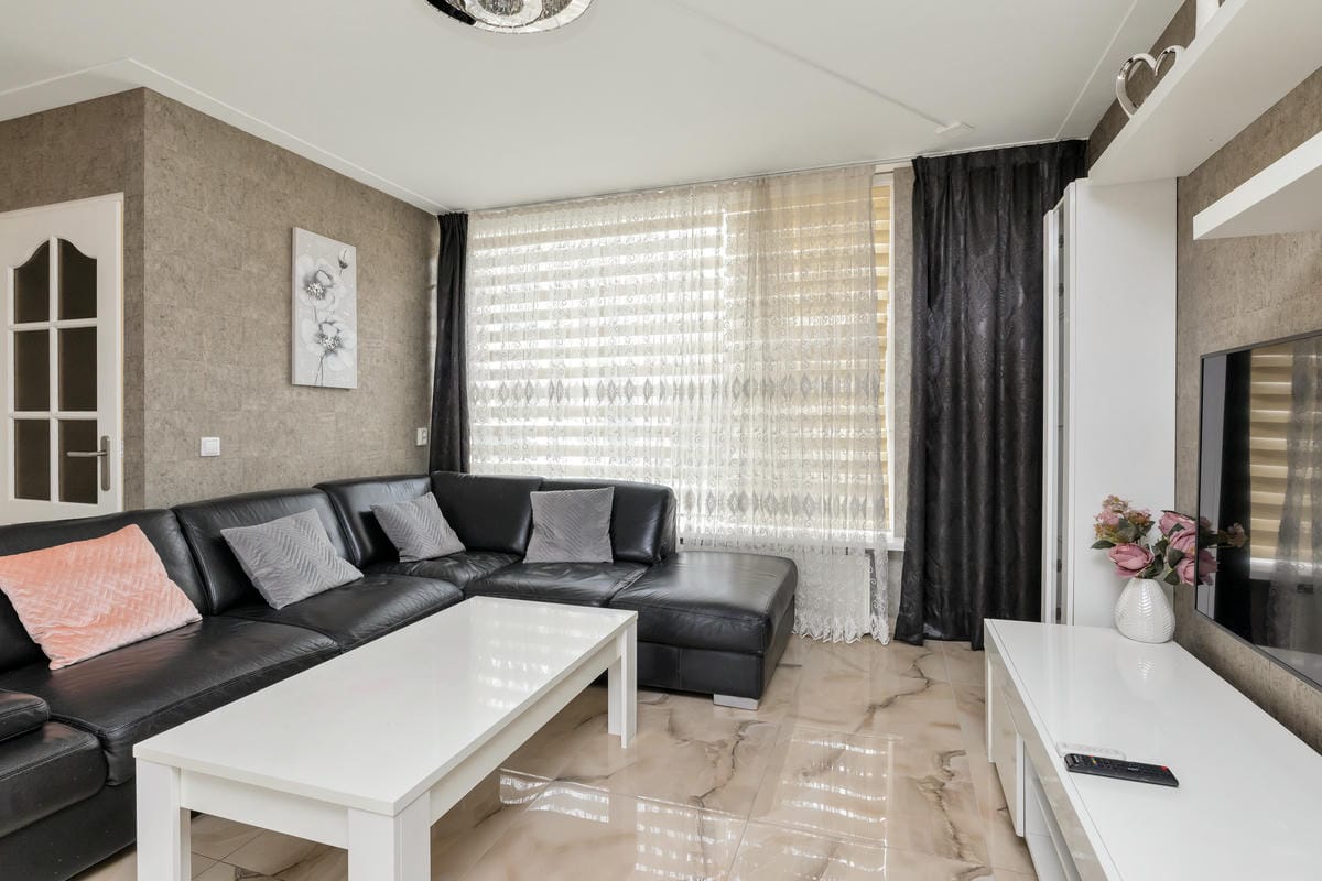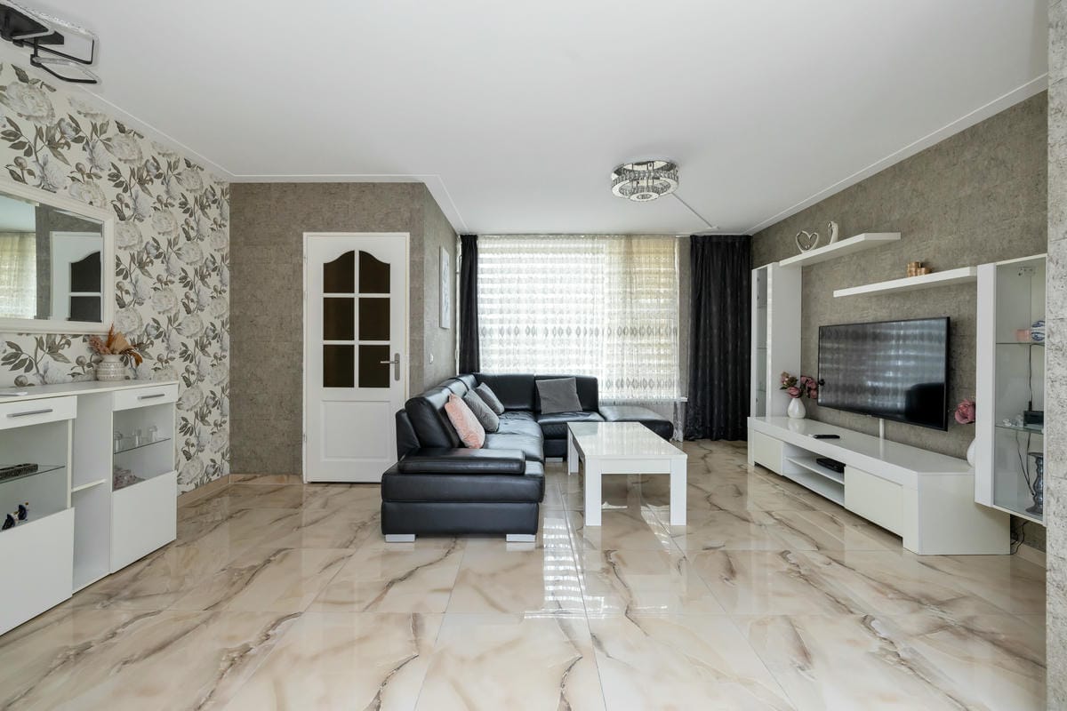 Bij binnenkomst via de entreehal komt u in de lichte woonkamer, die in open verbinding staat met de woonkeuken. De woonkamer is voorzien van een luxe marmeren vloer met vloerverwarming, aangelegd in 2020, en biedt voldoende ruimte voor een grote zithoek. De keuken is uitgerust met een vaatwasser, oven, magnetron, koel-vriescombinatie, apothekerskast en een hoekcarrousel voor pannen.