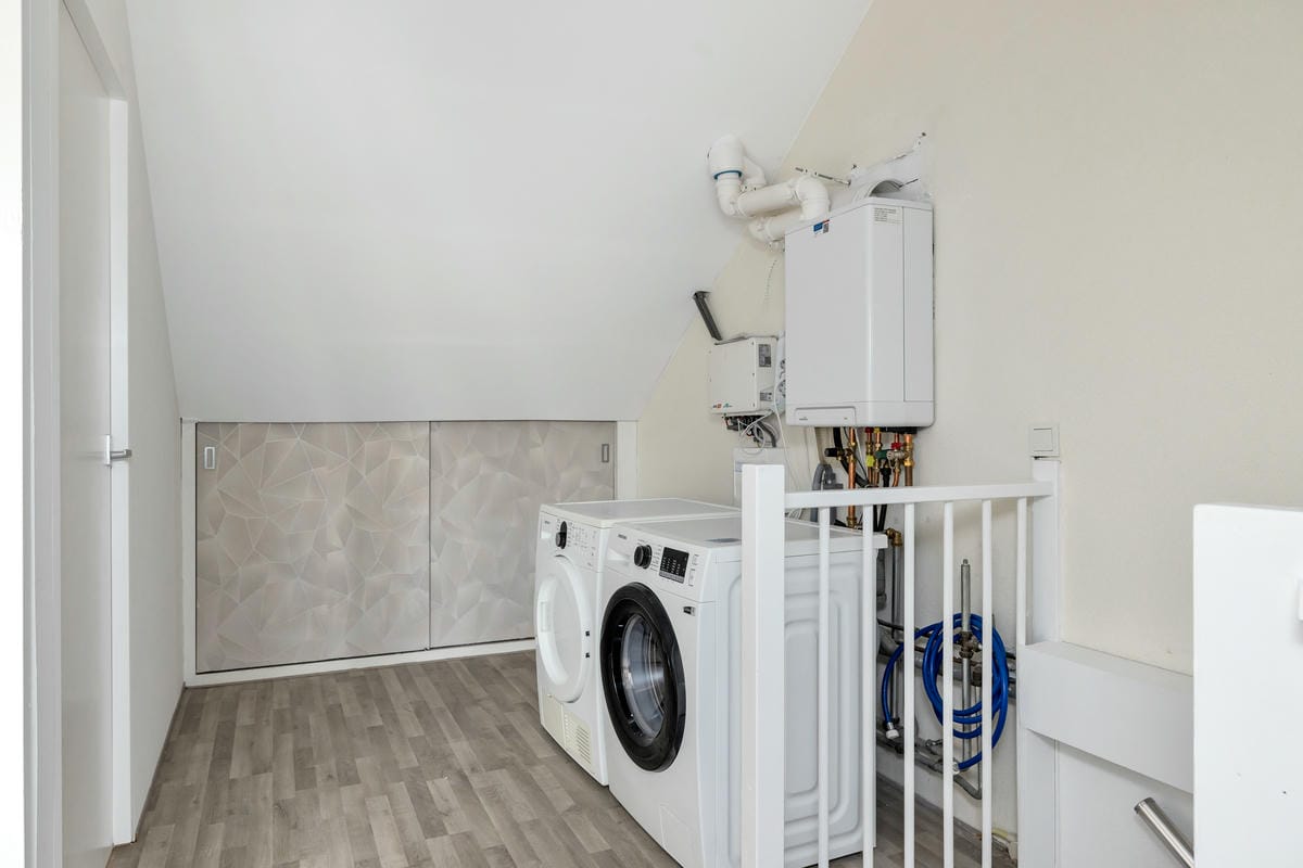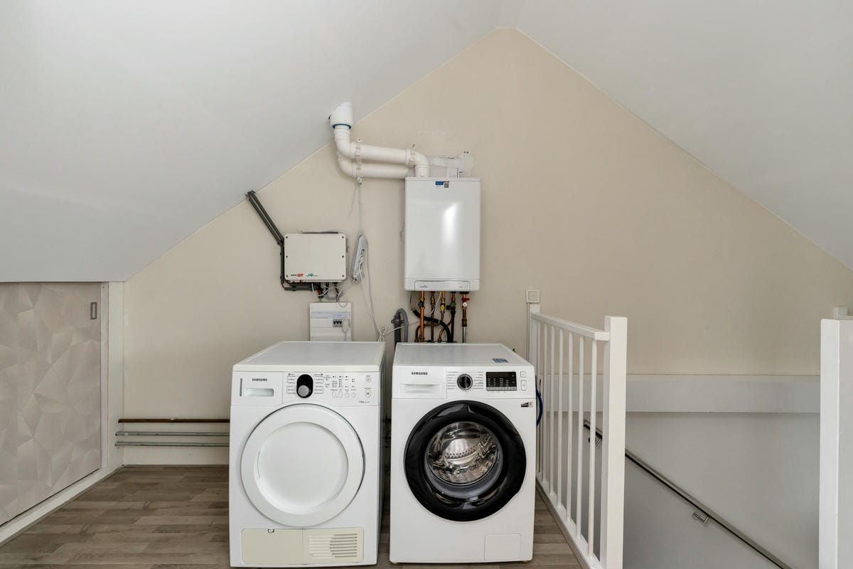Tweede verdieping: Overloop, voorzolder met cv-ketel en wasmachine/droger opstelling, 2 grote slaapkamers met dakkapel, knieschotten voor extra bergruimte.