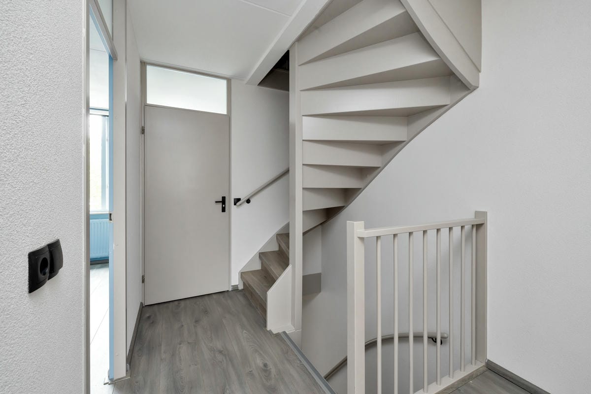 - Laminaattegelvloer op de begane grond, beklede trappen en spachtelputz wanden