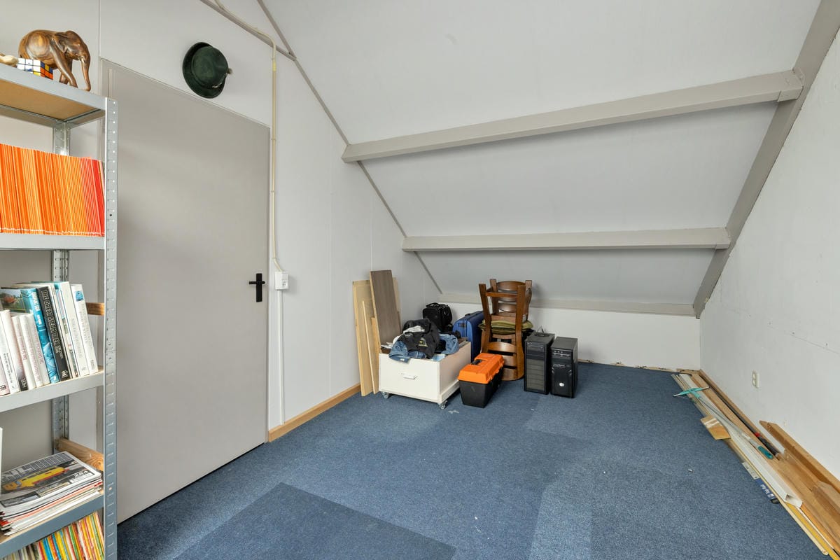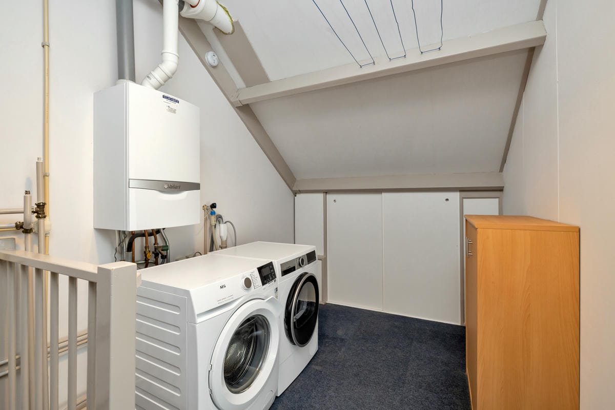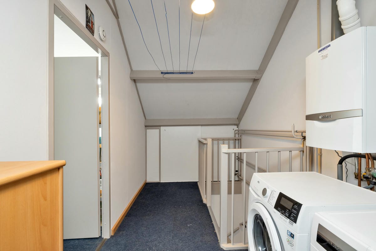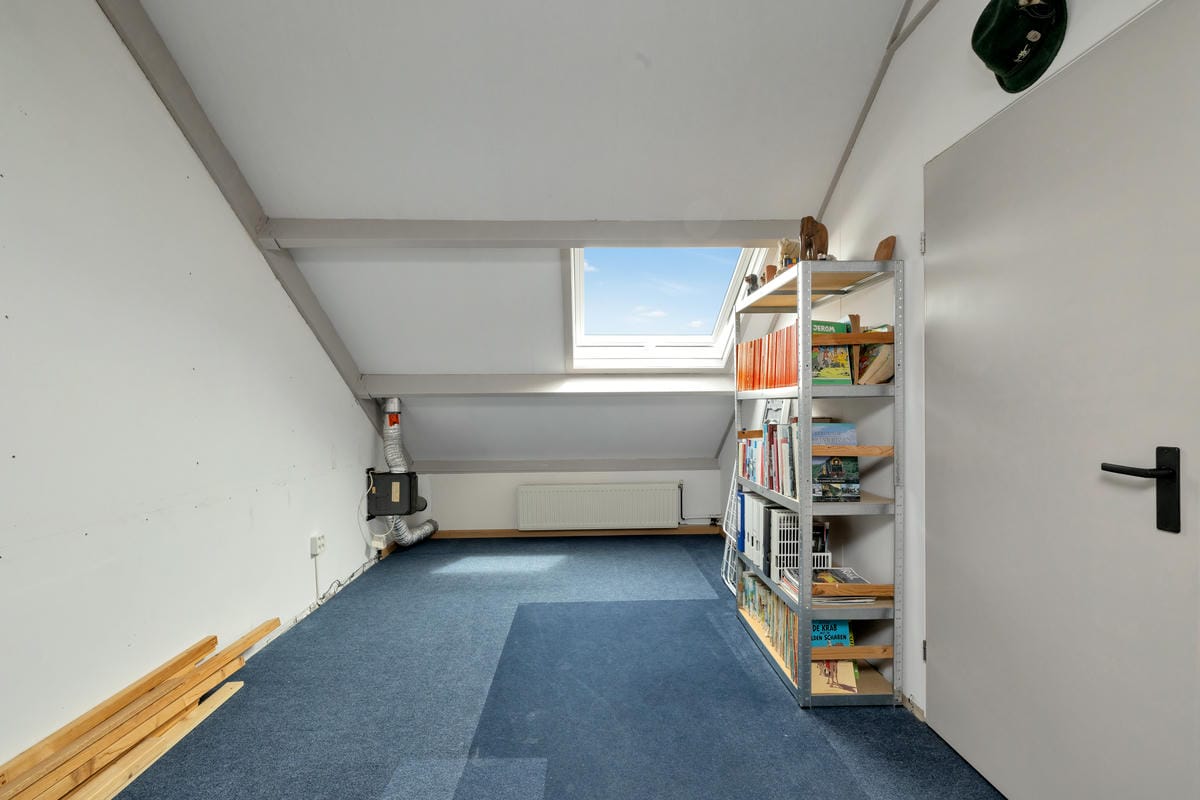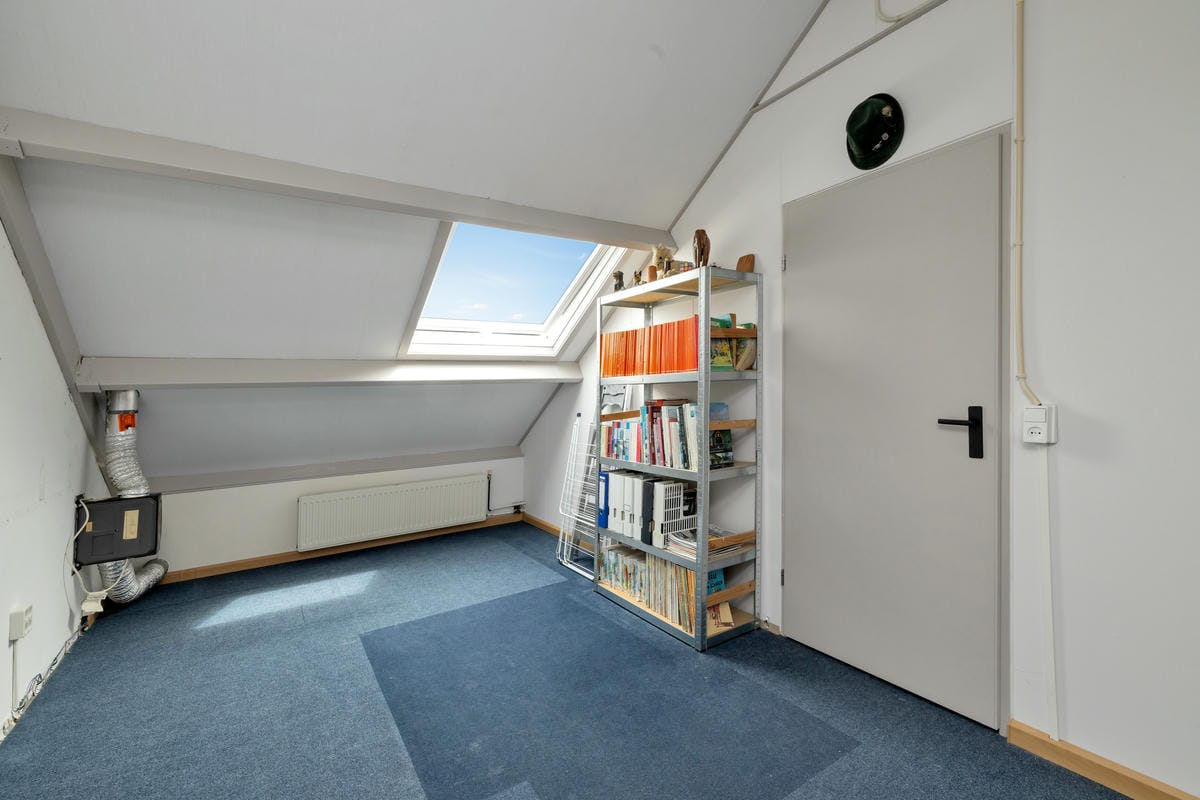 Tweede verdieping: Voorzolder met knieschotten, wasmachine-aansluiting en CV-ketel (Vaillant, eigendom, 2014). Ruime zolderkamer met kunststof dakraam en mogelijkheid voor het plaatsen van twee dakkapellen.