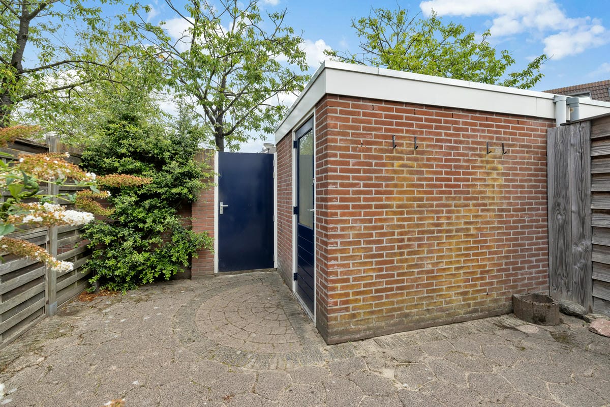 - Achtertuin met vrijstaande stenen berging (dak vernieuwd in 2024) en achterom