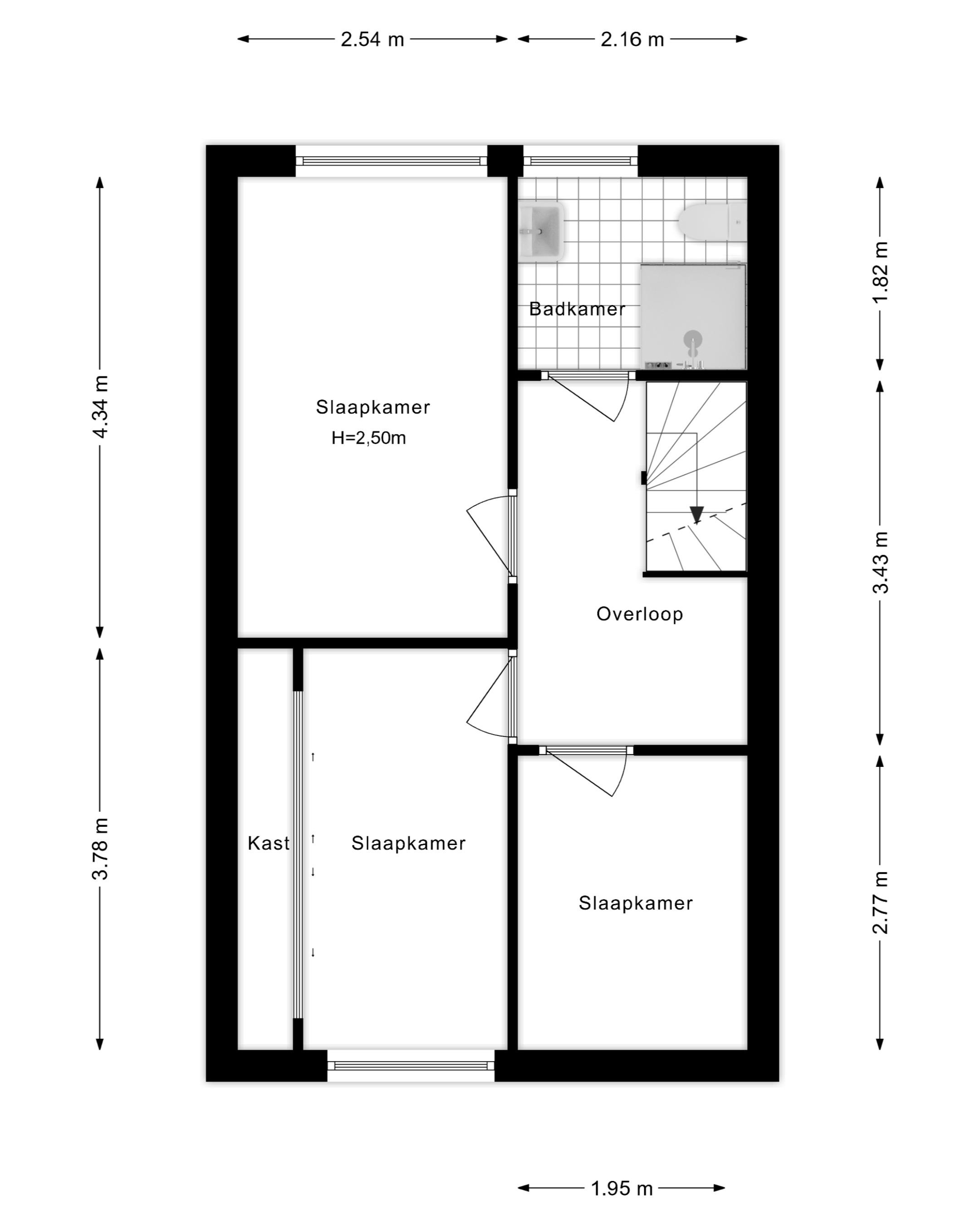 Eerste verdieping: Overloop met spachtelputz wandafwerking. Drie slaapkamers, waarvan twee met vaste kastenwand. Badkamer met douchecabine, toilet en wastafel.