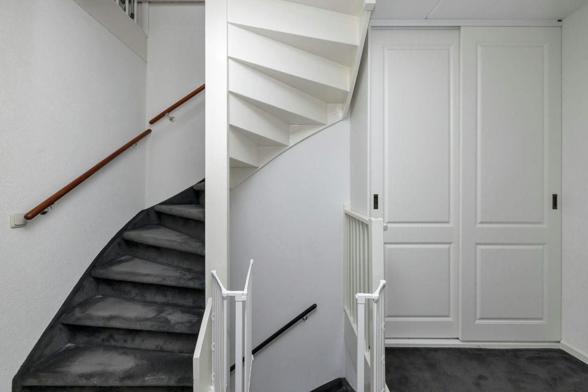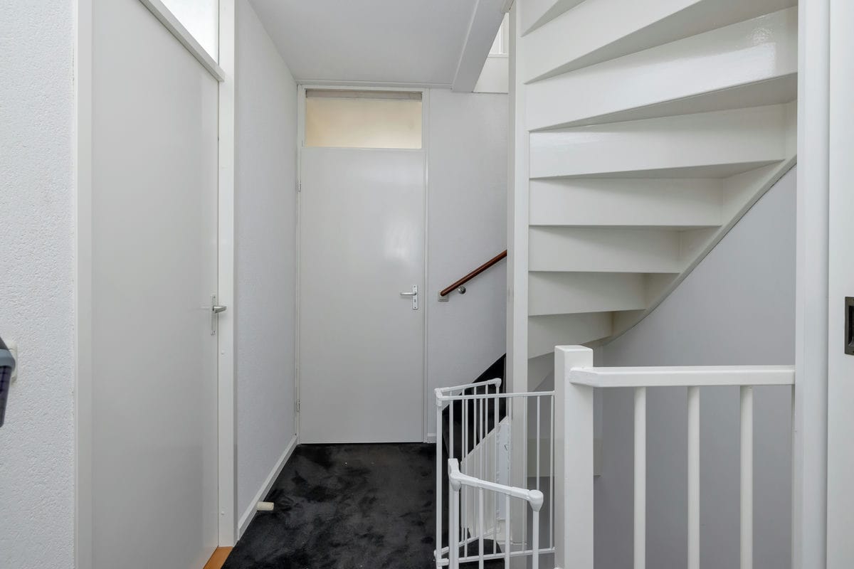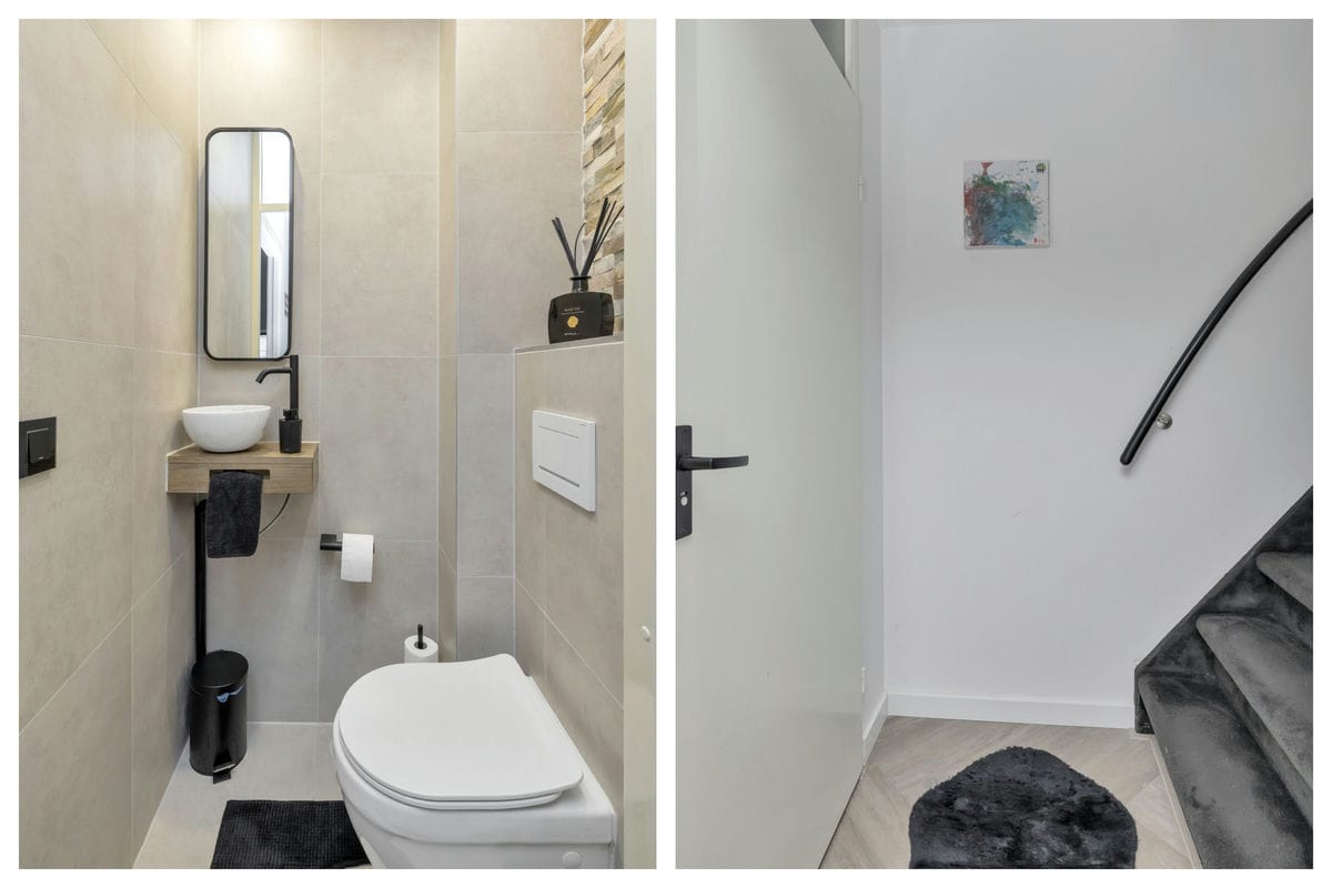 Grenzend aan de keuken bevindt zich een tweede hal met het toilet en de trap naar de eerste verdieping. Het toilet is in 2023 volledig vernieuwd.