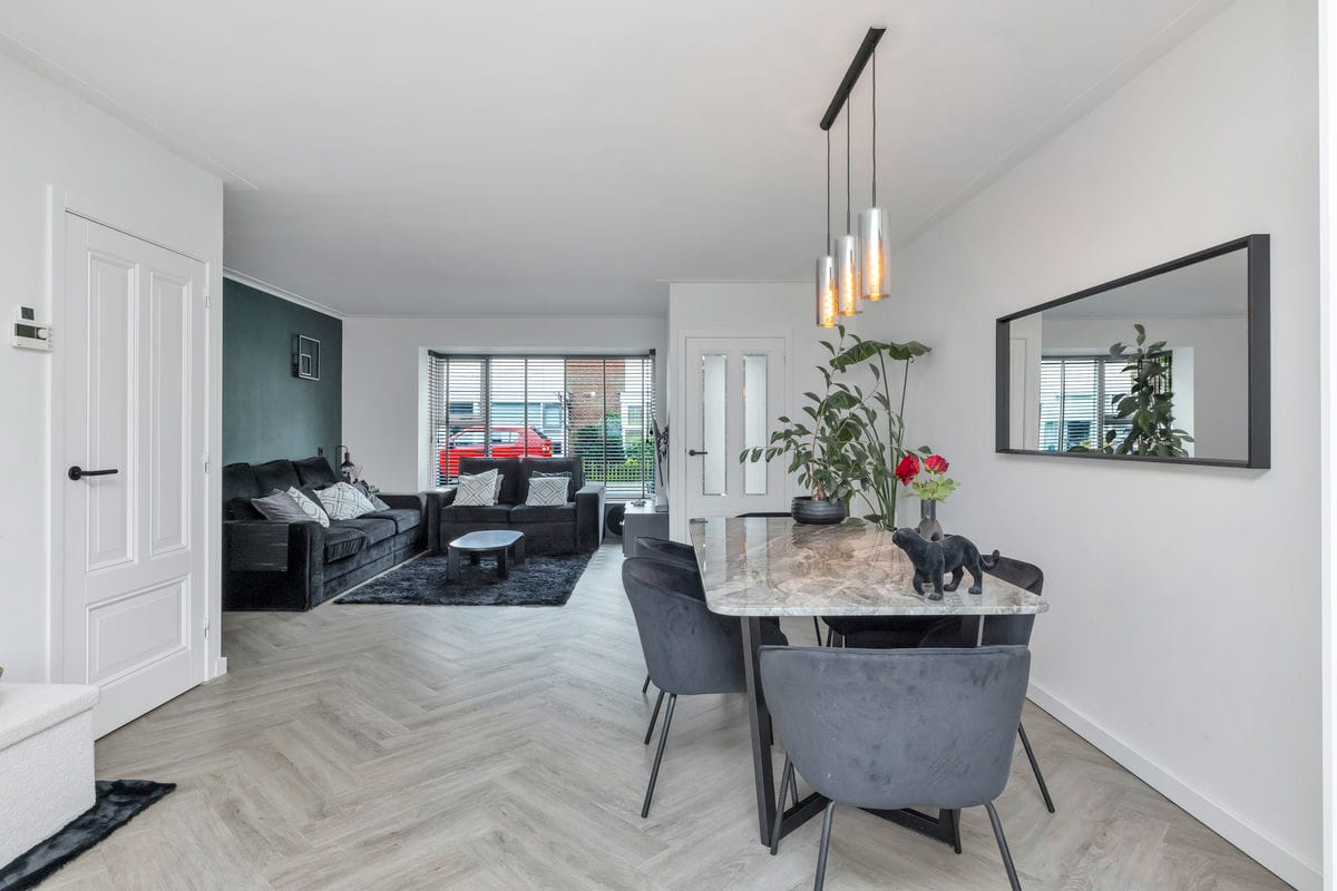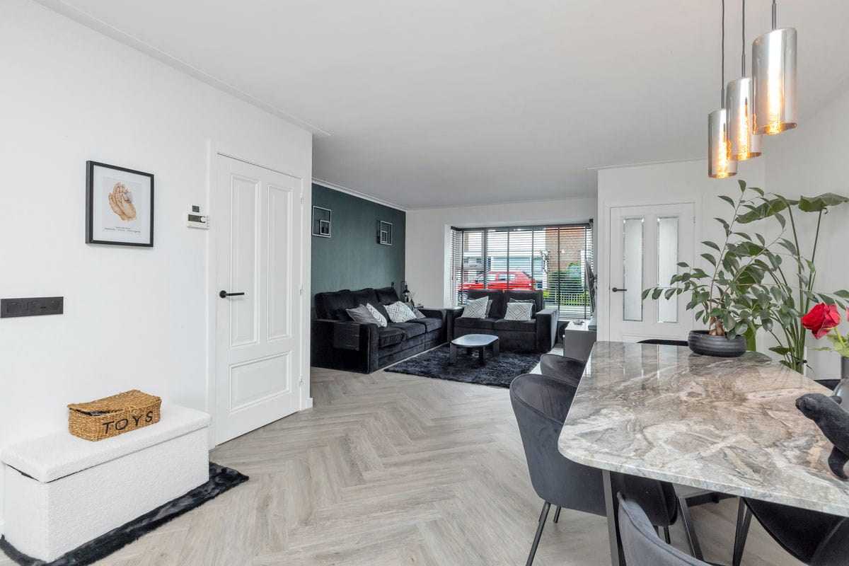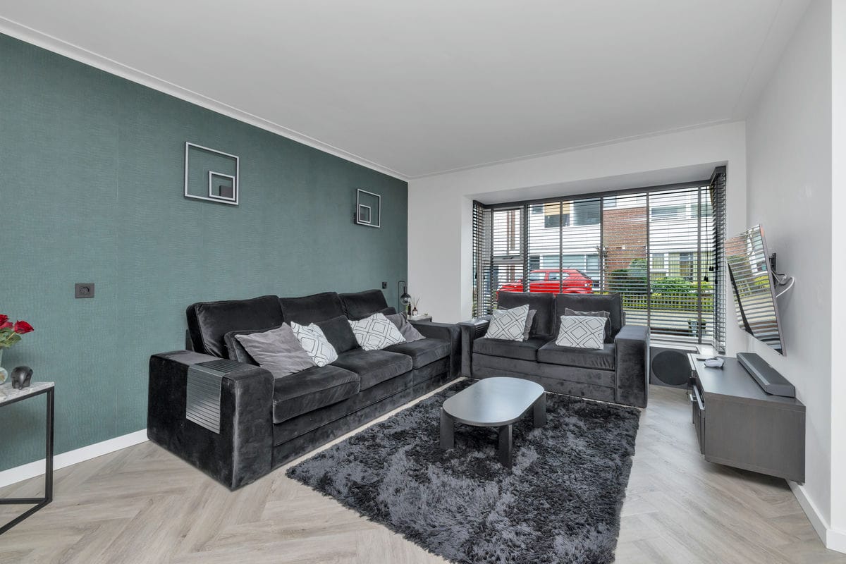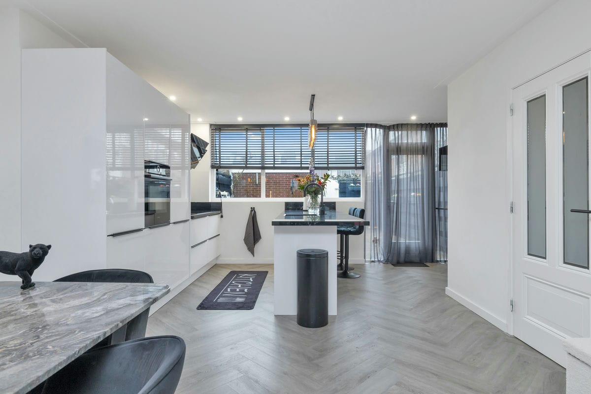Bij binnenkomst via de entreehal bereikt u de lichte woonkamer, die in open verbinding staat met de moderne woonkeuken. De woonkamer beschikt over een erkerkozijn aan de voorzijde en is afgewerkt met een stijlvolle visgraat PVC-vloer met vloerverwarming.