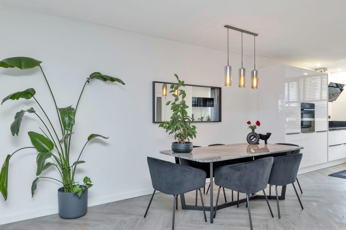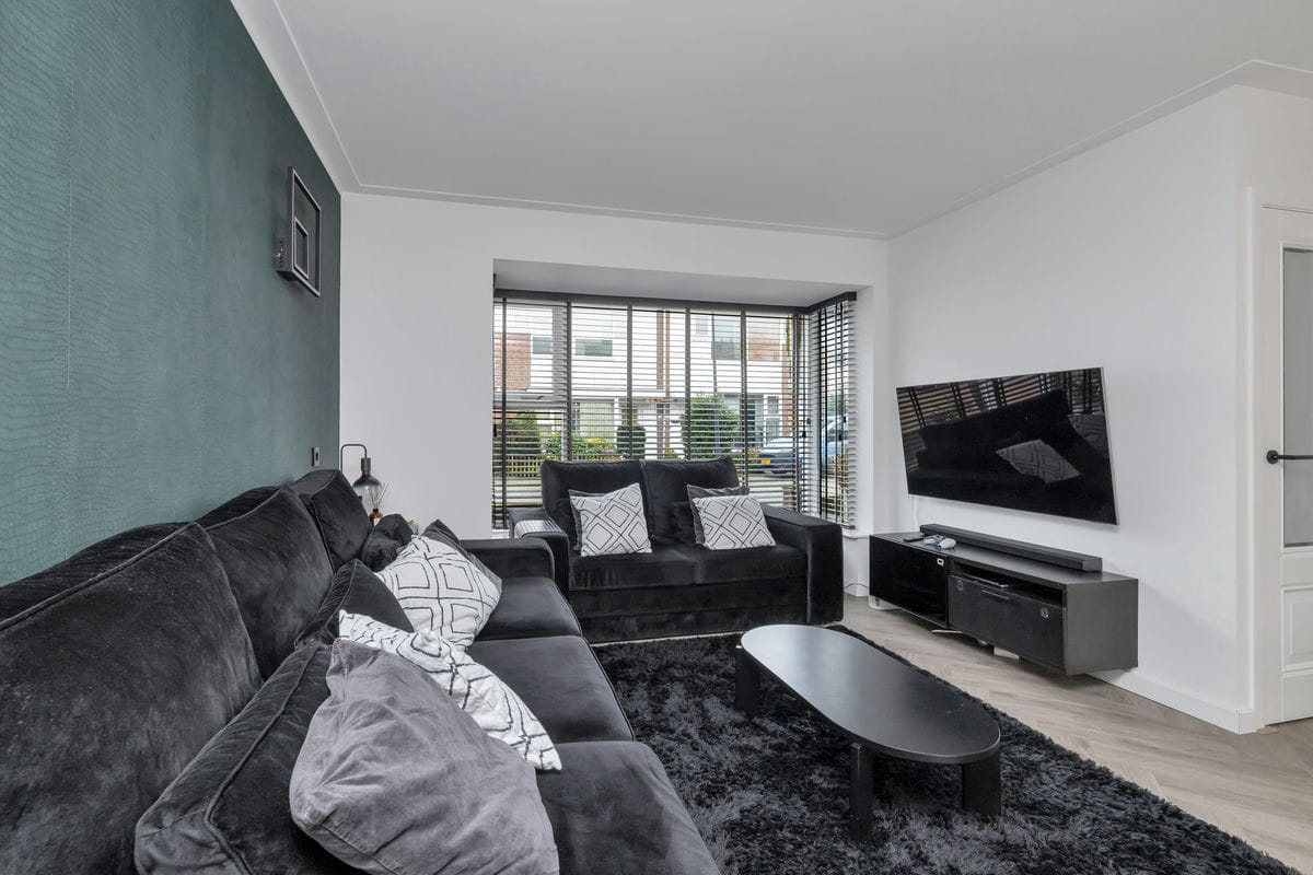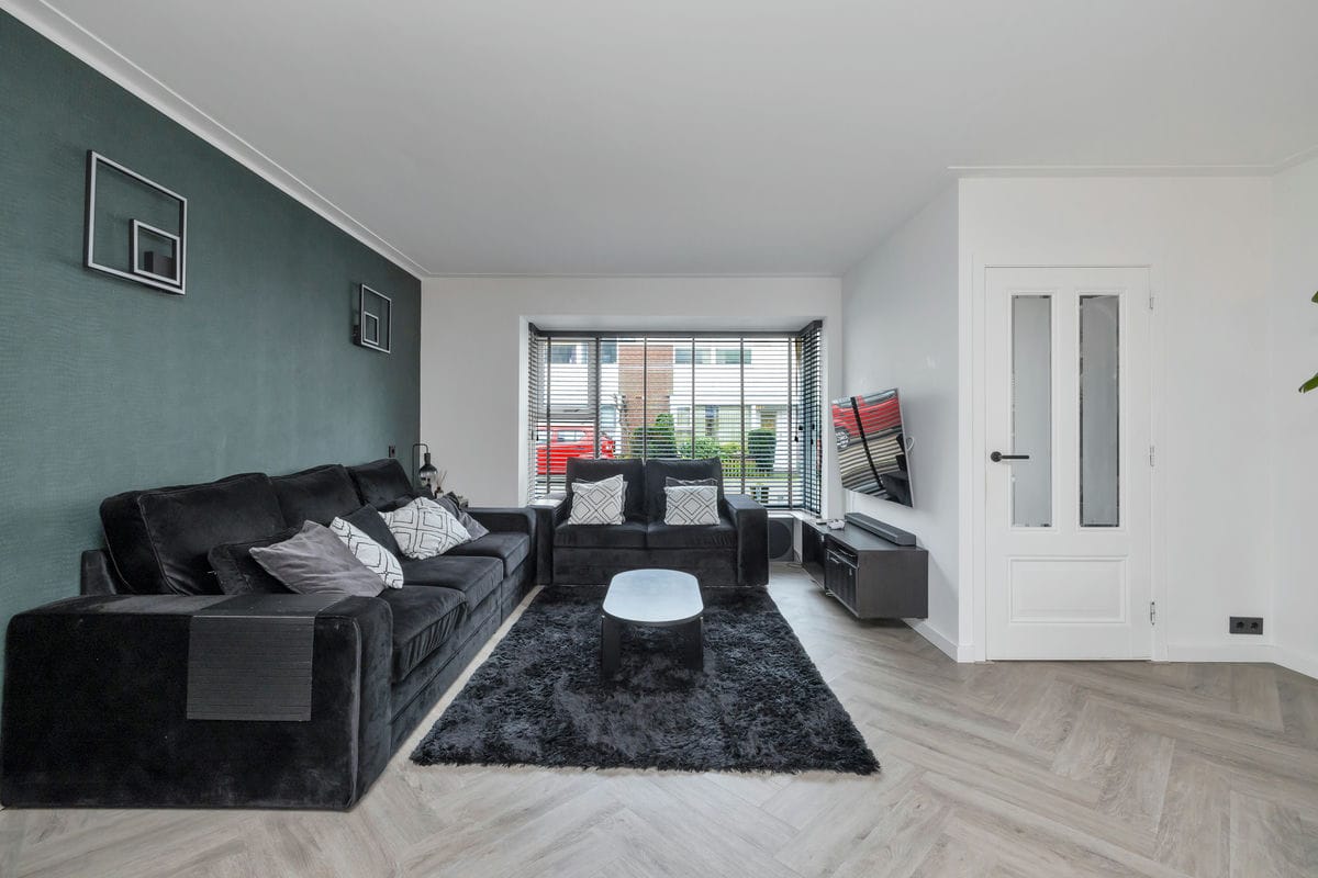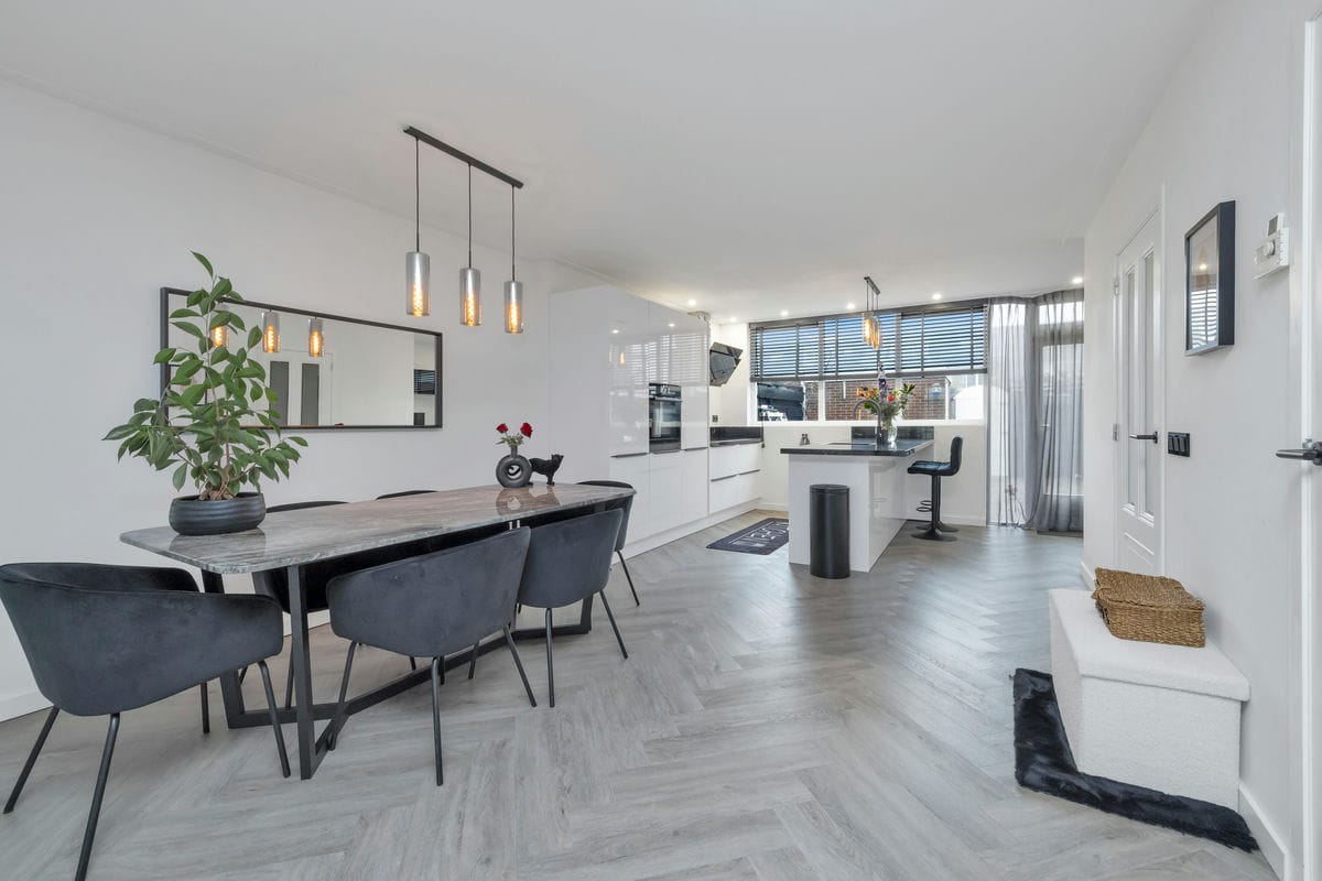 Bij binnenkomst via de entreehal bereikt u de lichte woonkamer, die in open verbinding staat met de moderne woonkeuken. De woonkamer beschikt over een erkerkozijn aan de voorzijde en is afgewerkt met een stijlvolle visgraat PVC-vloer met vloerverwarming.