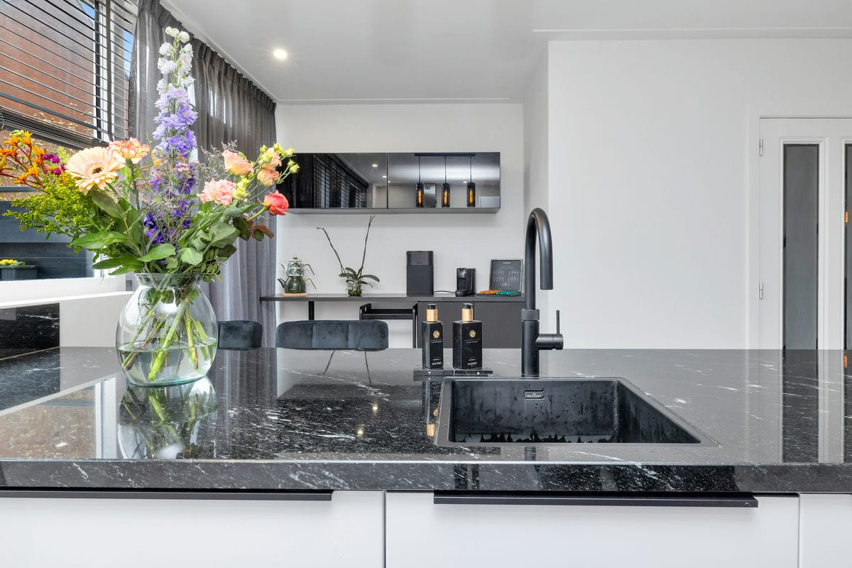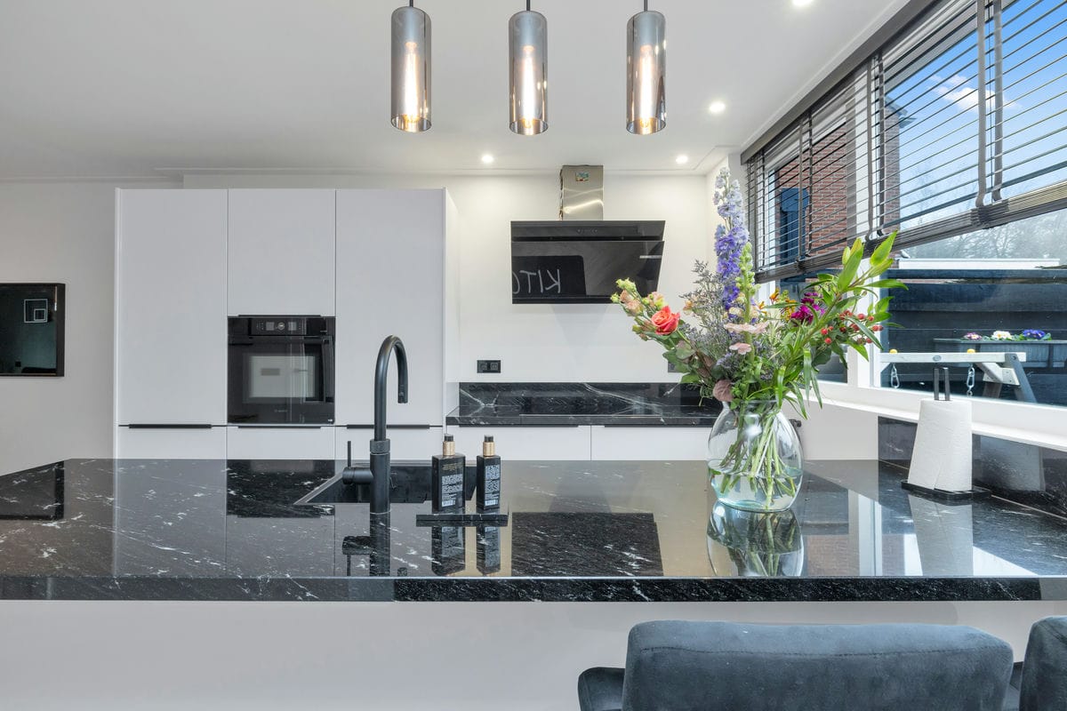 - Zeer luxe keuken (2021) met spoeleiland, granieten aanrechtblad, design afzuigkap en diverse inbouwapparatuur;