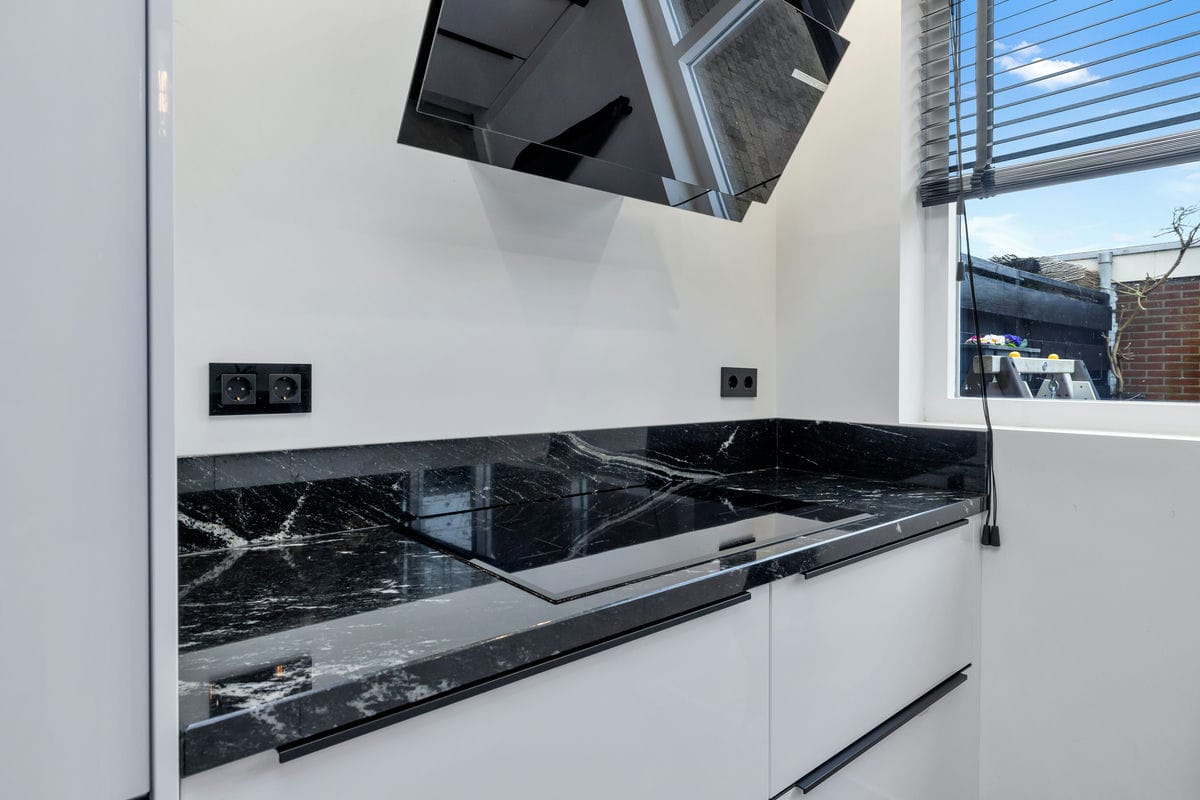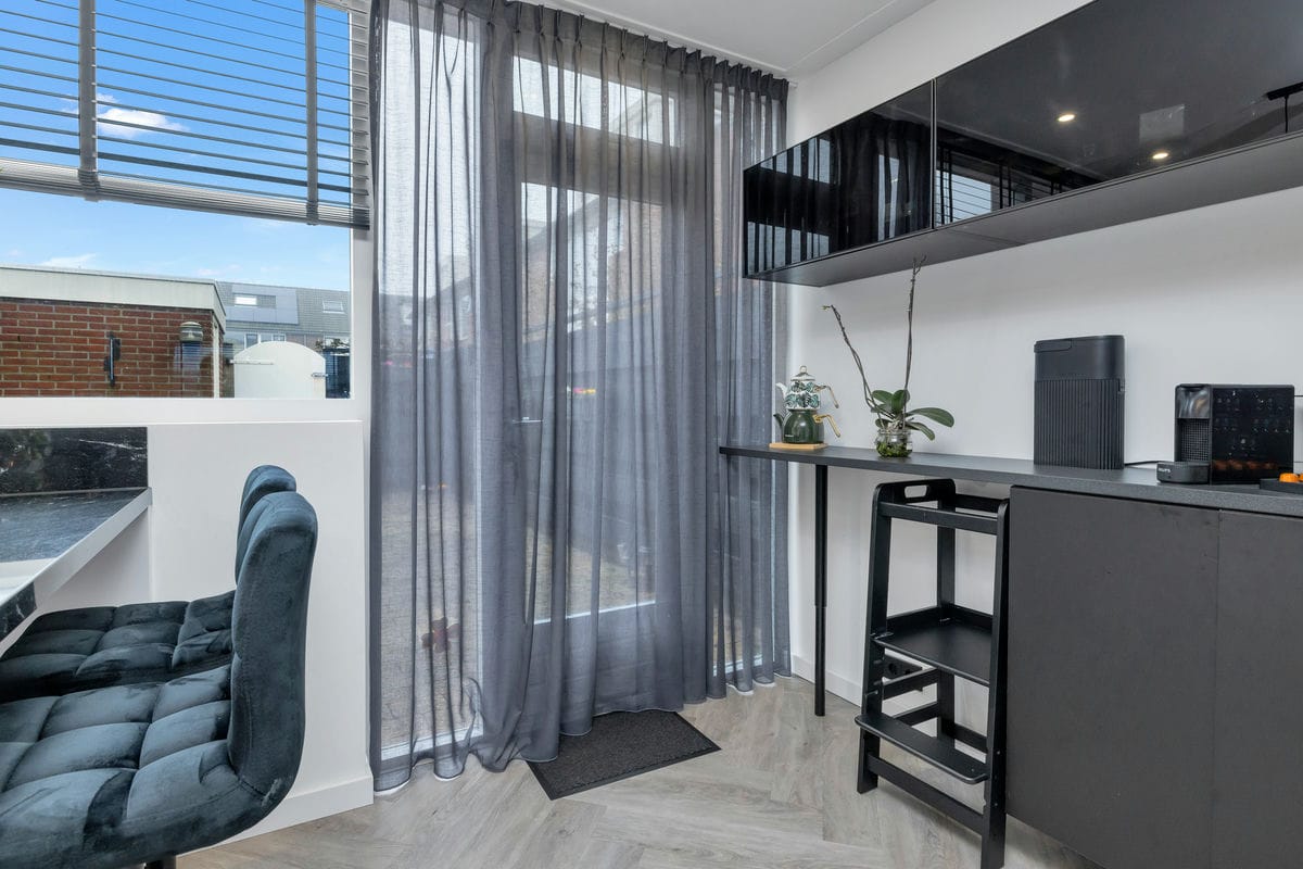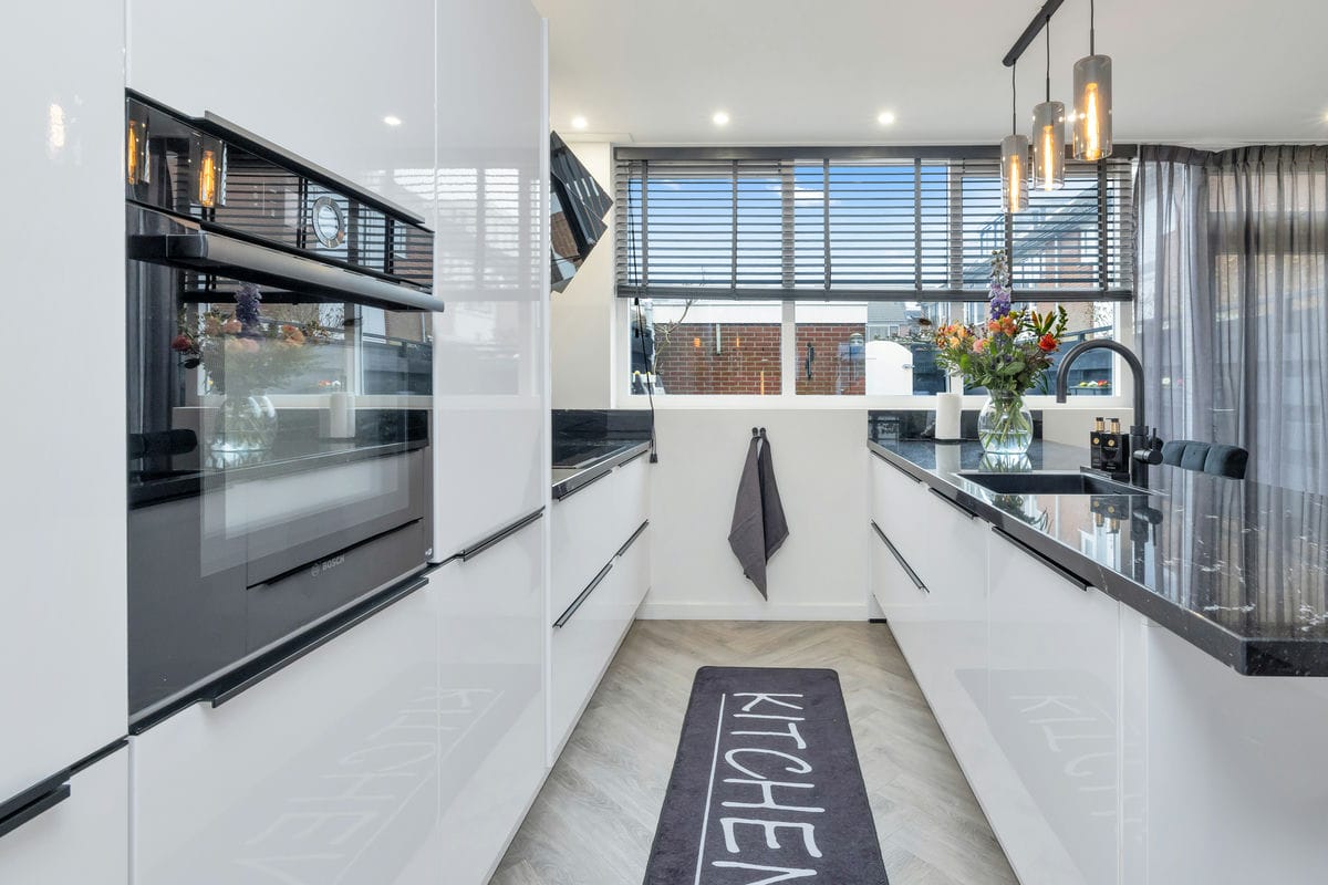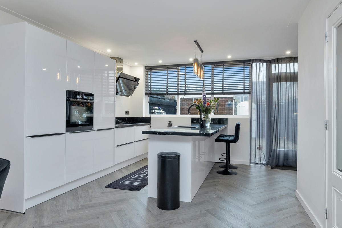 De luxe woonkeuken, volledig vernieuwd in 2021, is van alle gemakken voorzien. U vindt hier een design afzuigkap, een granieten werkblad, een vaatwasser, een inductiekookplaat, een Quooker, een combimagnetron, een grote vrieskist, een aparte koelkast, een koffiecorner en een spoeleiland. Vanuit de keuken heeft u toegang tot de nette en onderhoudsvriendelijke achtertuin. Deze tuin, bereikbaar via een achterom, beschikt over een stenen berging met voldoende ruimte voor fietsen.
