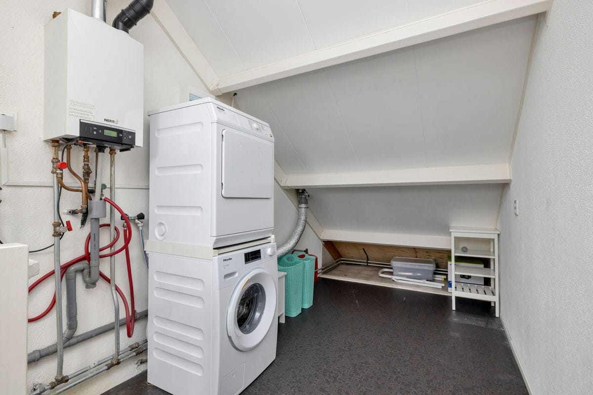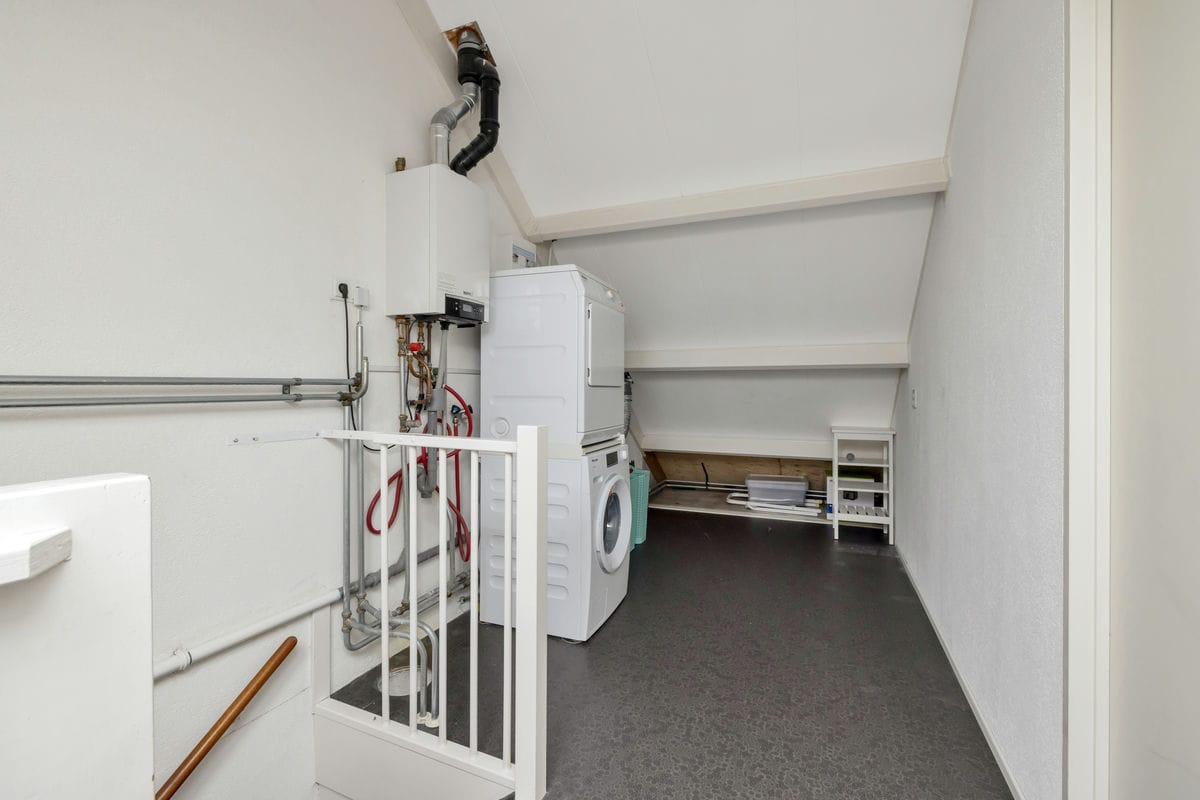 Tweede verdieping: Overloop, voorzolder met cv-ketel en wasmachine/droger opstelling, 1 grote slaapkamer met dakkapel, knieschotten voor extra bergruimte.
