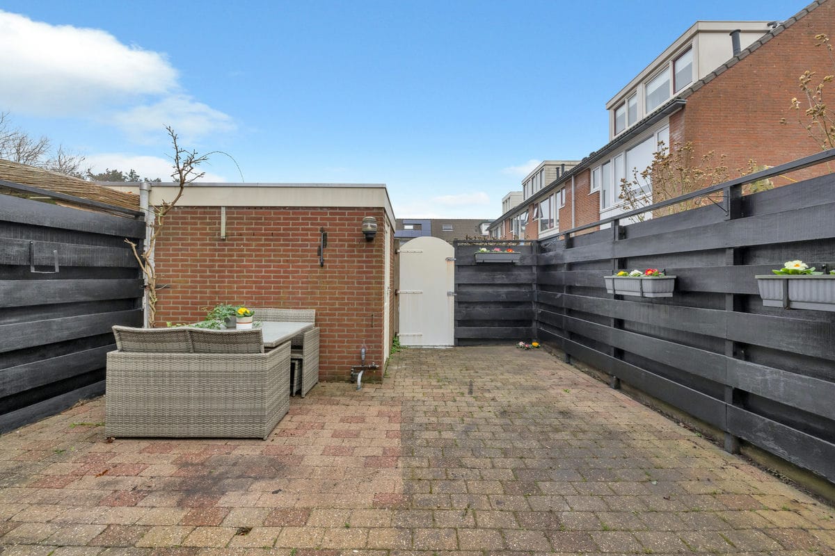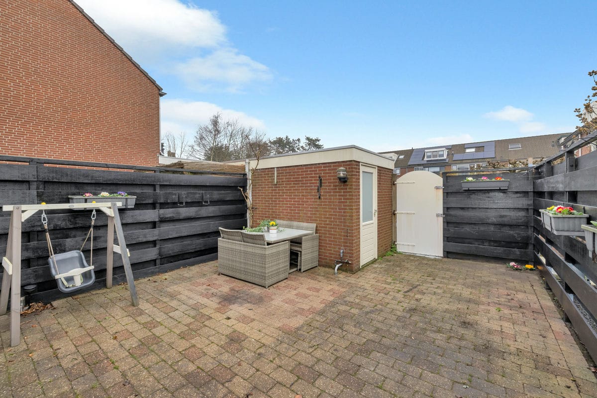 - Verzorgde achtertuin op het noordoosten met stenen berging en achterom;
