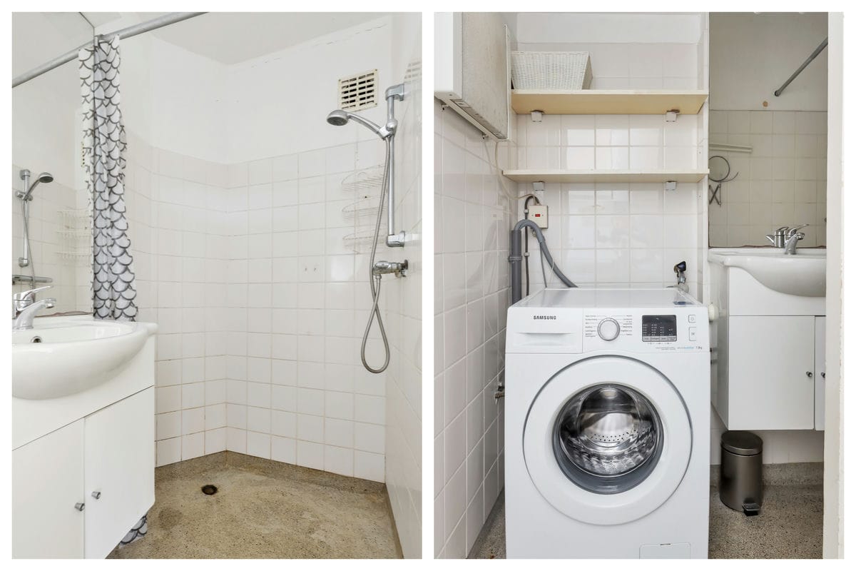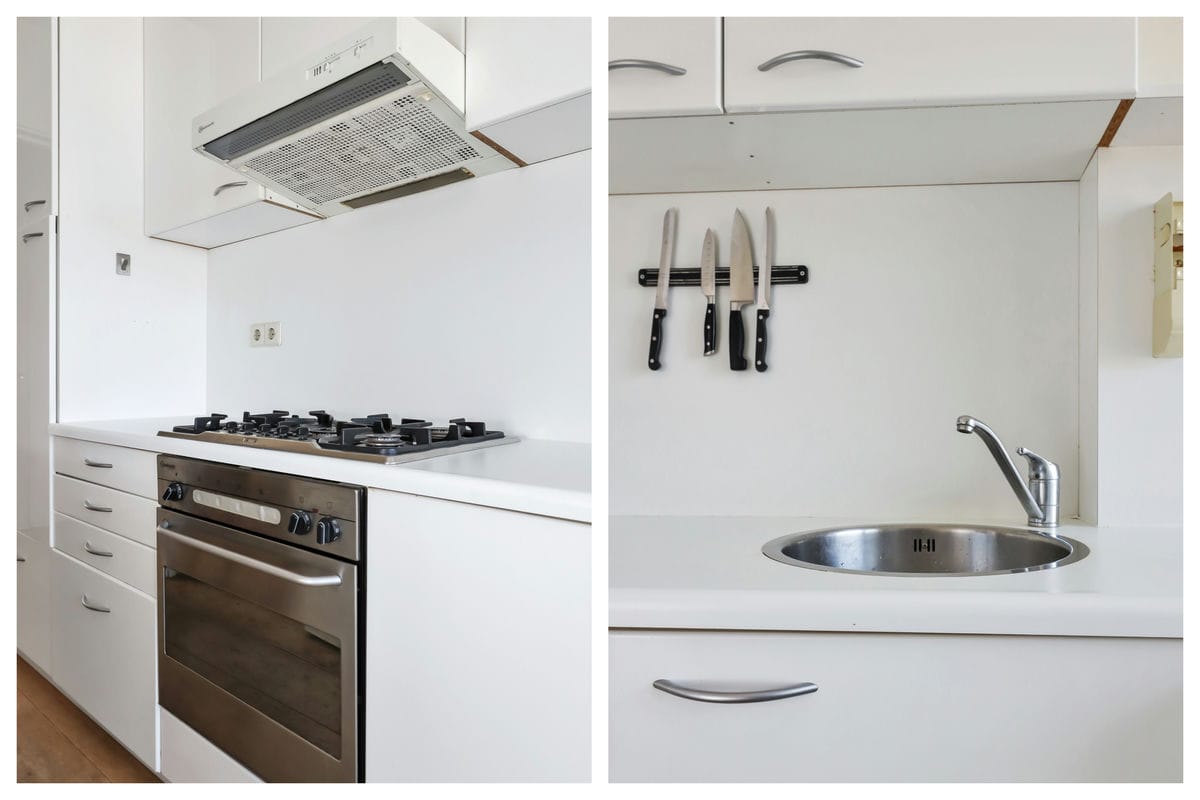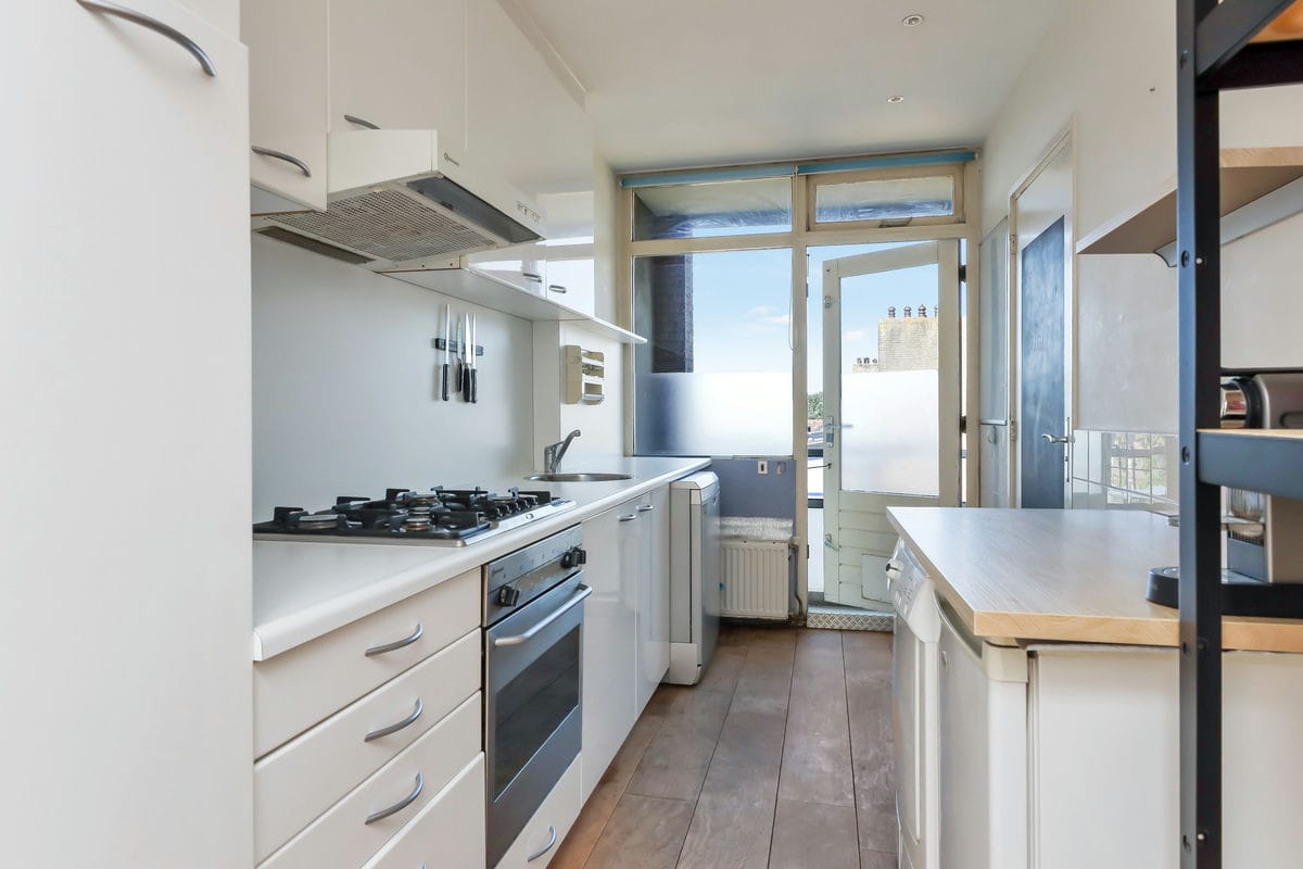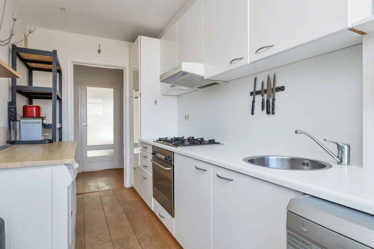 De keuken is netjes en geeft toegang tot het tweede balkon aan de achterzijde, gelegen op het westen. Vanuit de keuken bereik je ook de badkamer, waar plaats is voor een wasmachine en drogeropstelling.
