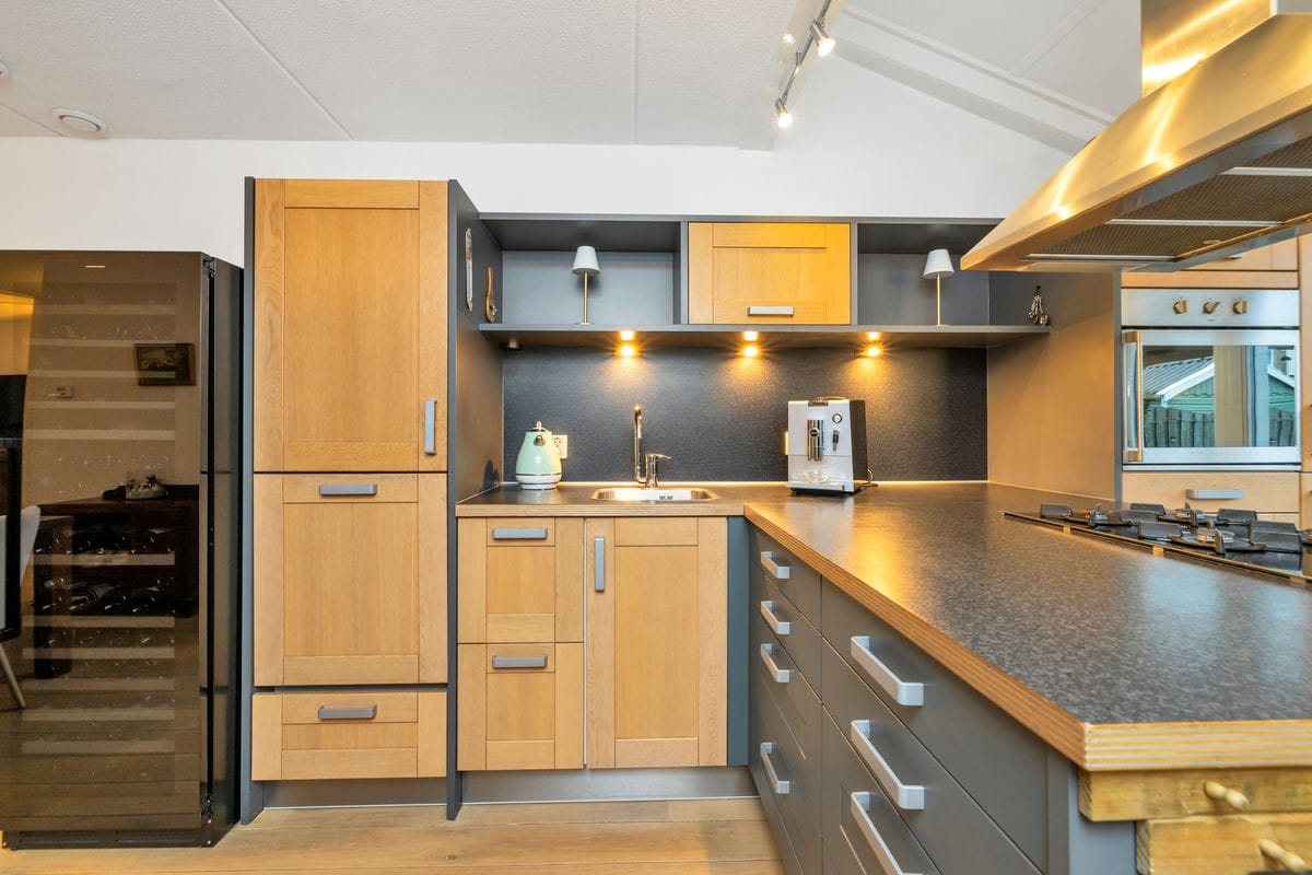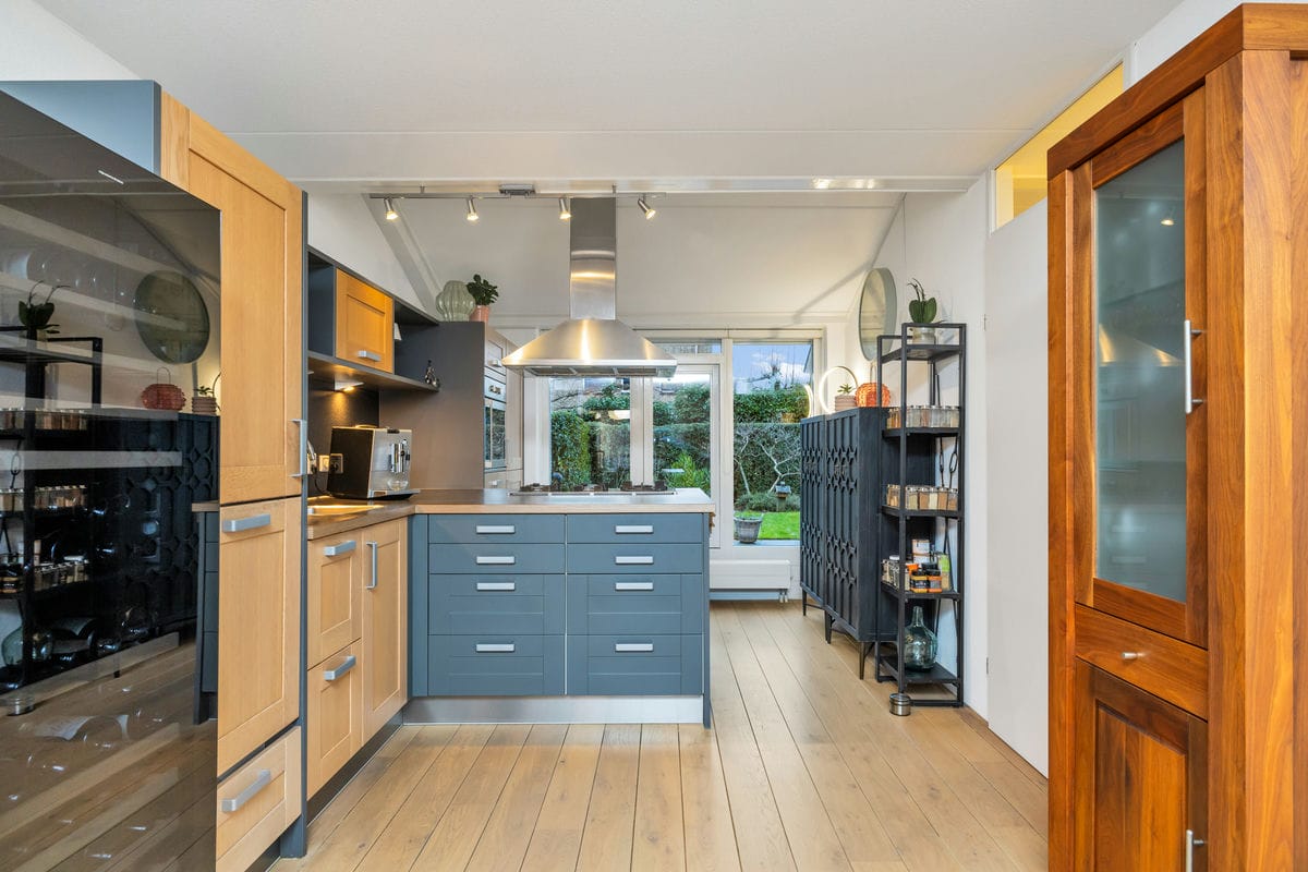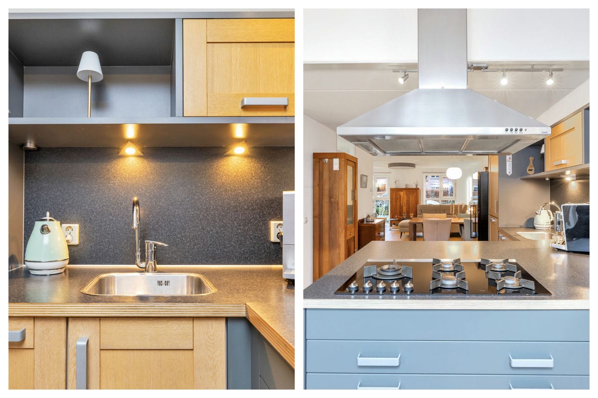 De keuken is van alle gemakken voorzien en uitgerust met een 5-pits gasfornuis, een close-in boiler, een wokbrander, een afzuigkap, een oven, een koel-vriescombinatie en een vaatwasser. Aangrenzend aan de keuken bevindt zich een praktische bijkeuken met een tegelvloer en een opstelling voor de wasmachine. Indien gewenst, kunt u de muur tussen de keuken en bijkeuken verwijderen, waardoor u de gehele achterzijde van de benedenverdieping als woonkeuken kunt inrichten.