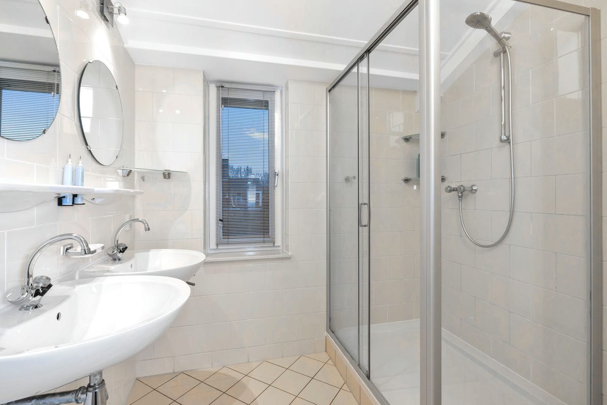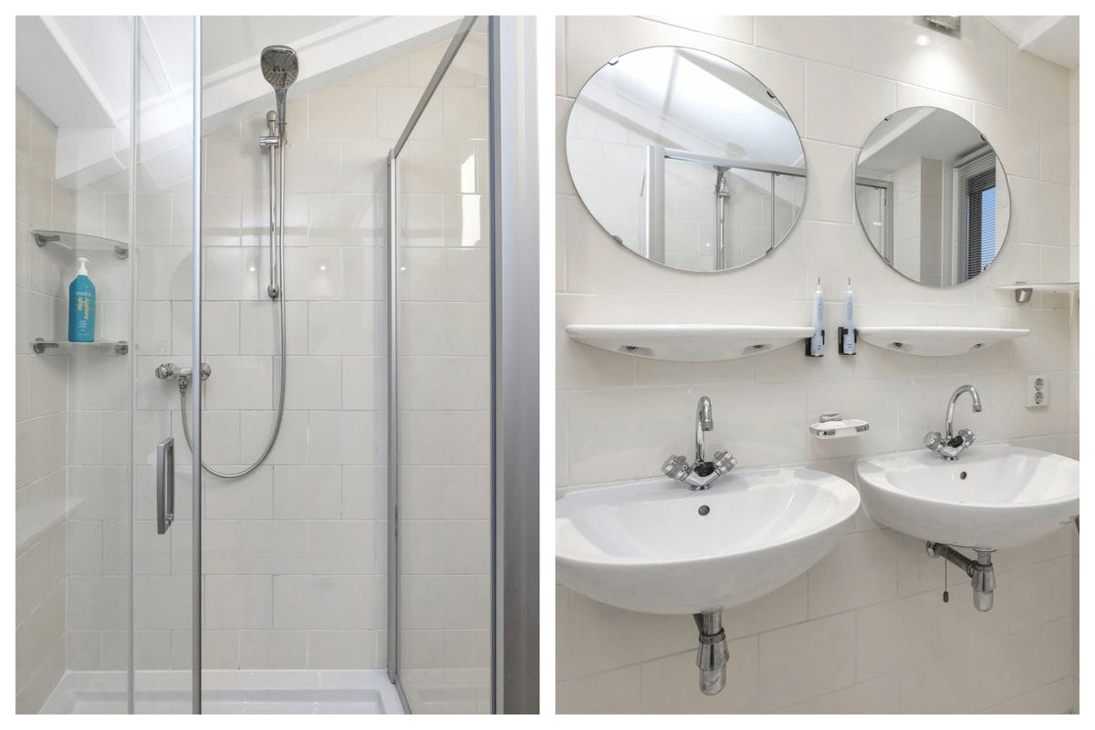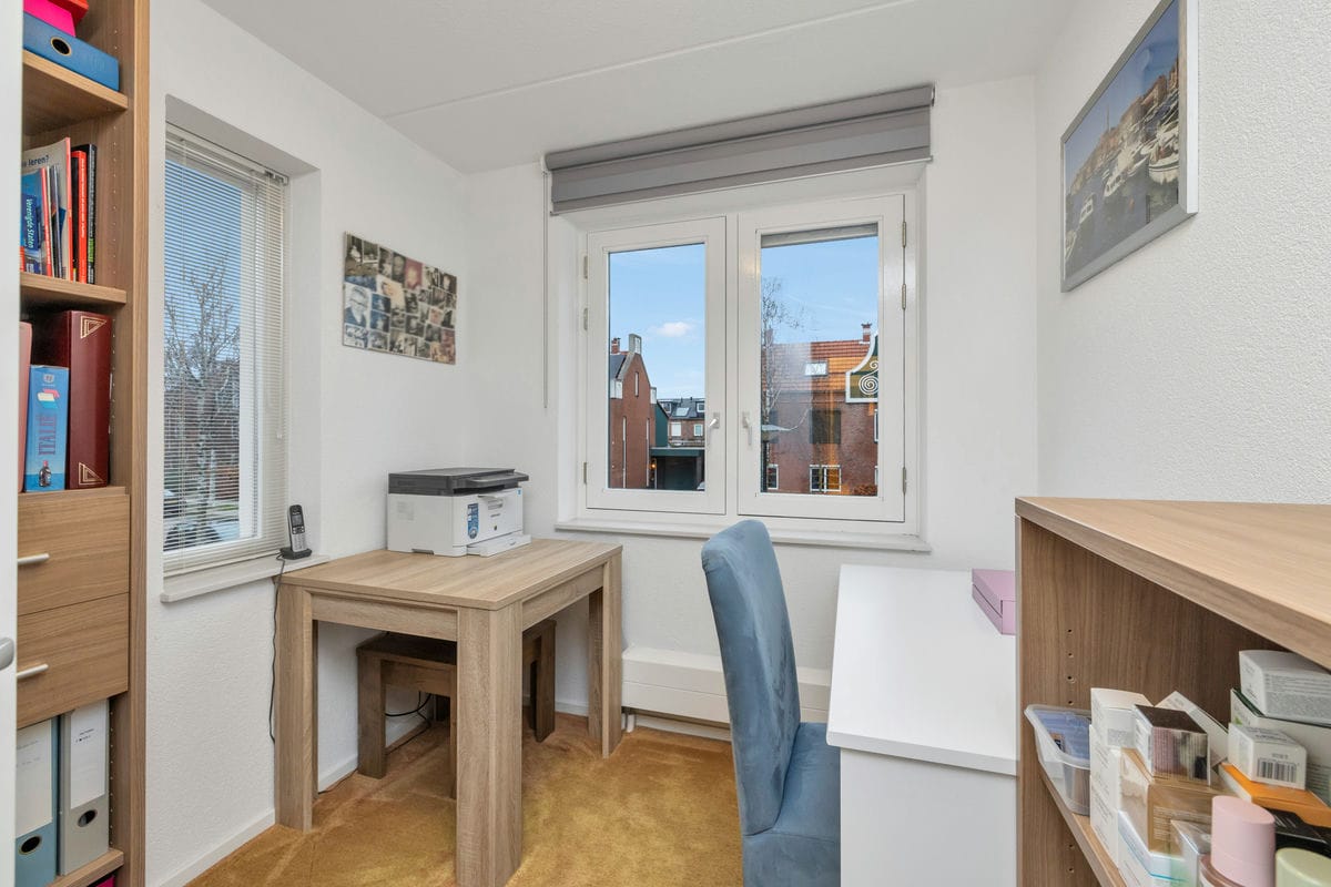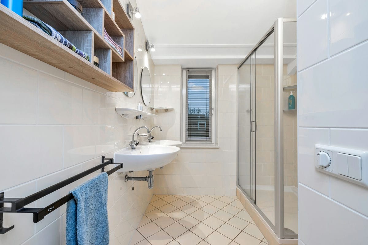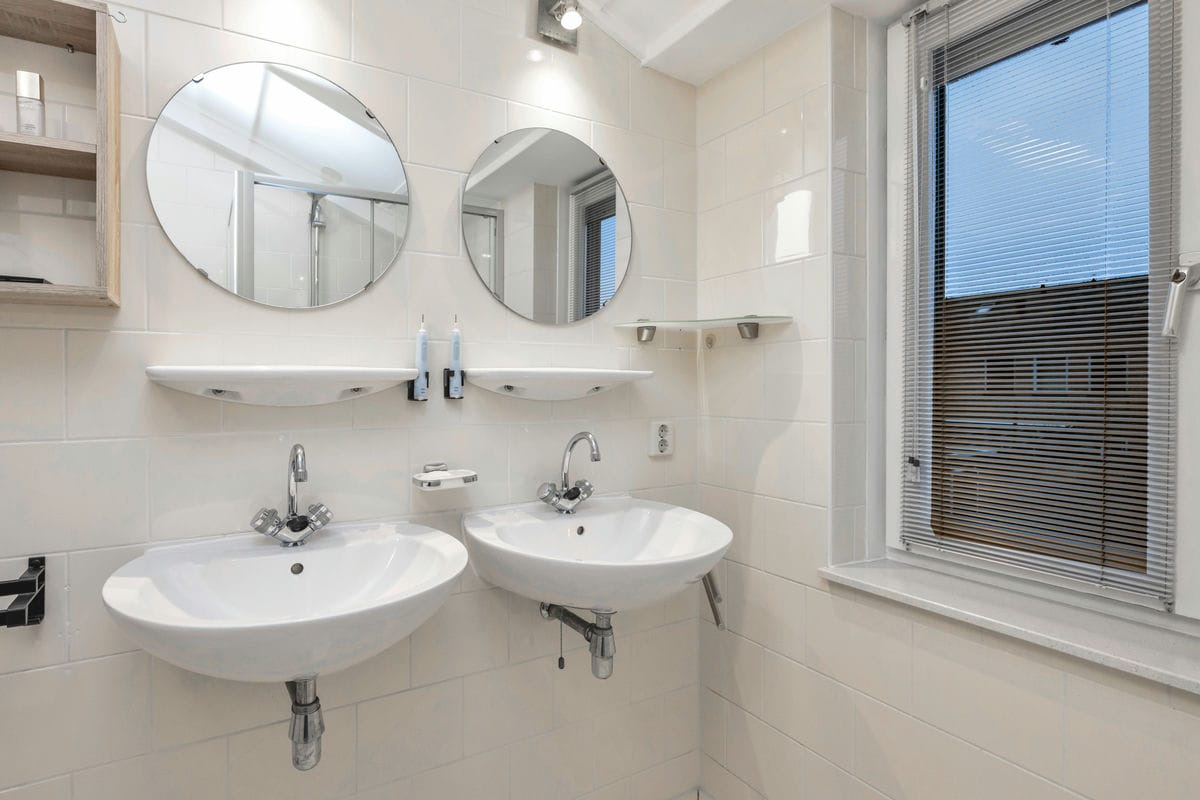 Op de eerste verdieping bevinden zich drie goed bemeten slaapkamers. De slaapkamer aan de achterzijde is uitgerust met screens voor zonwering, wat zorgt voor extra comfort tijdens warme dagen. De ruime badkamer beschikt over een grote douchecabine en twee wastafels. Op deze verdieping is tevens een apart toilet aanwezig.