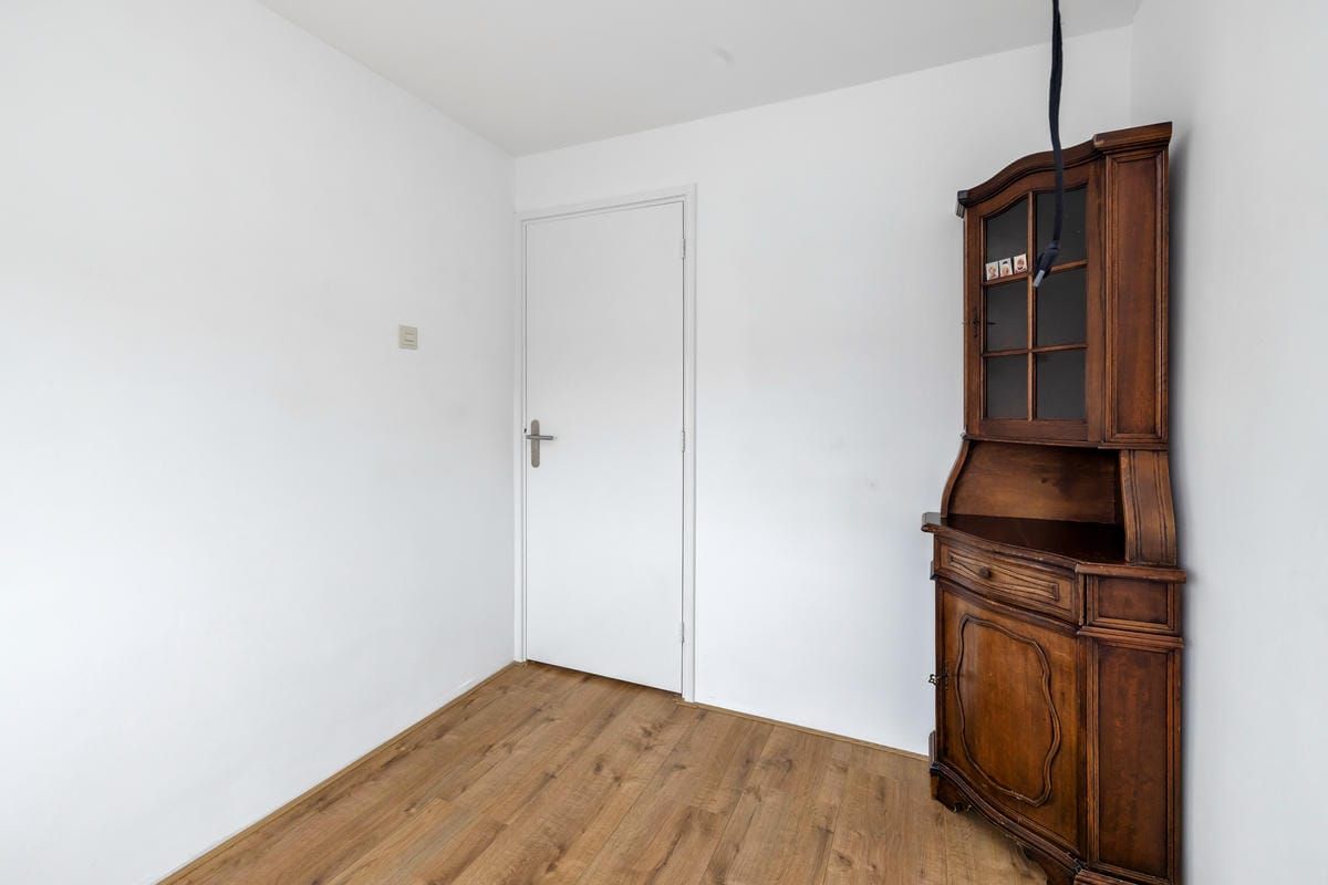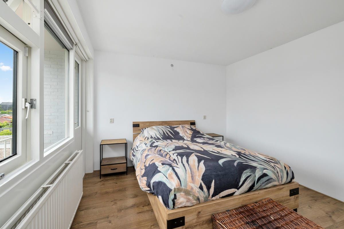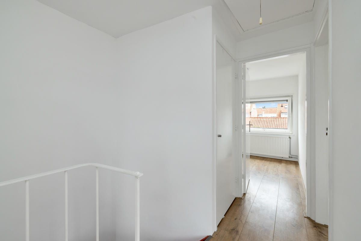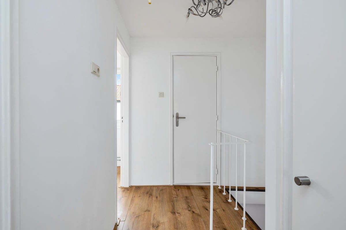 Eerste verdieping: Overloop met laminaatvloer en vaste kast. Drie lichte slaapkamers, waarvan twee met vaste kast en één met balkon. Badkamer aan de voorzijde.