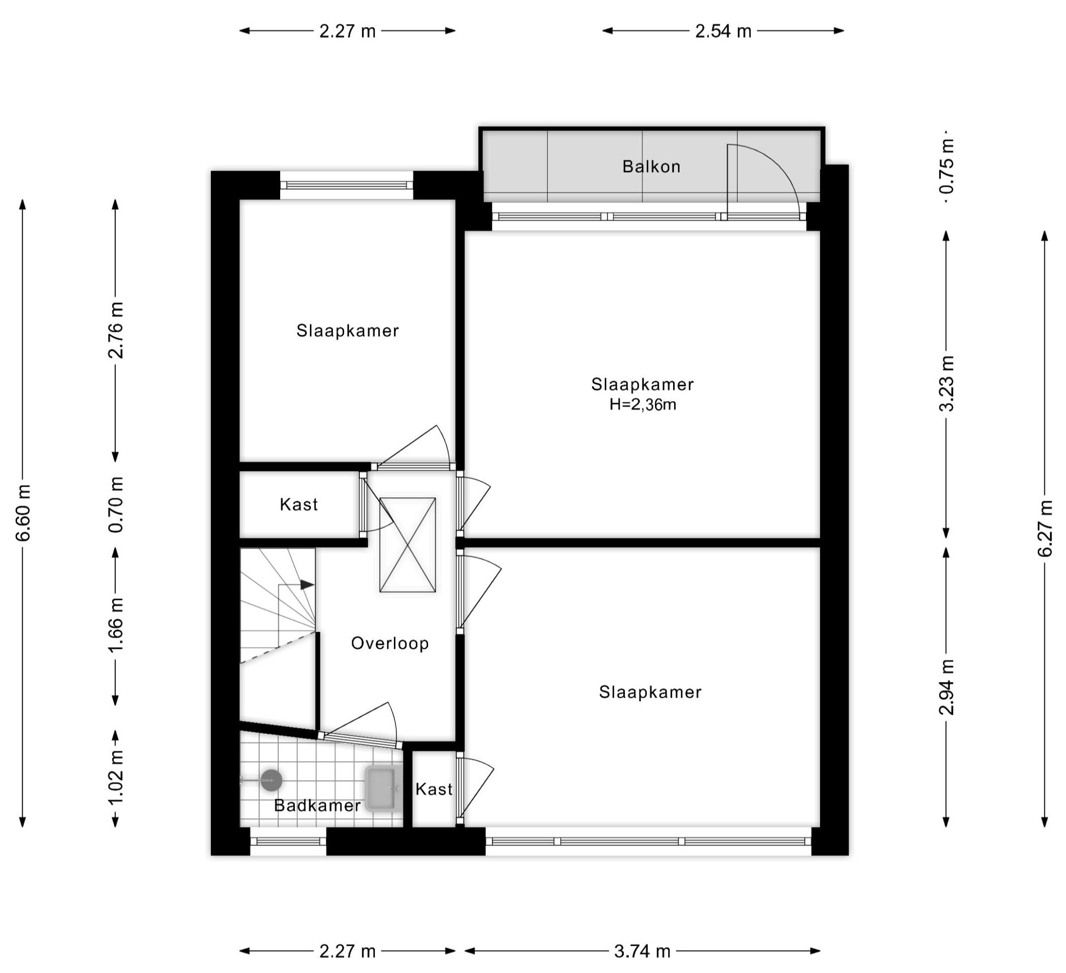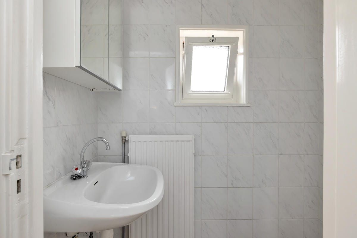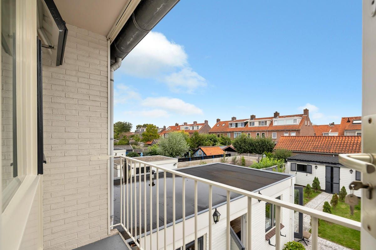 Eerste verdieping: Overloop met laminaatvloer en vaste kast. Drie lichte slaapkamers, waarvan twee met vaste kast en één met balkon. Badkamer aan de voorzijde.