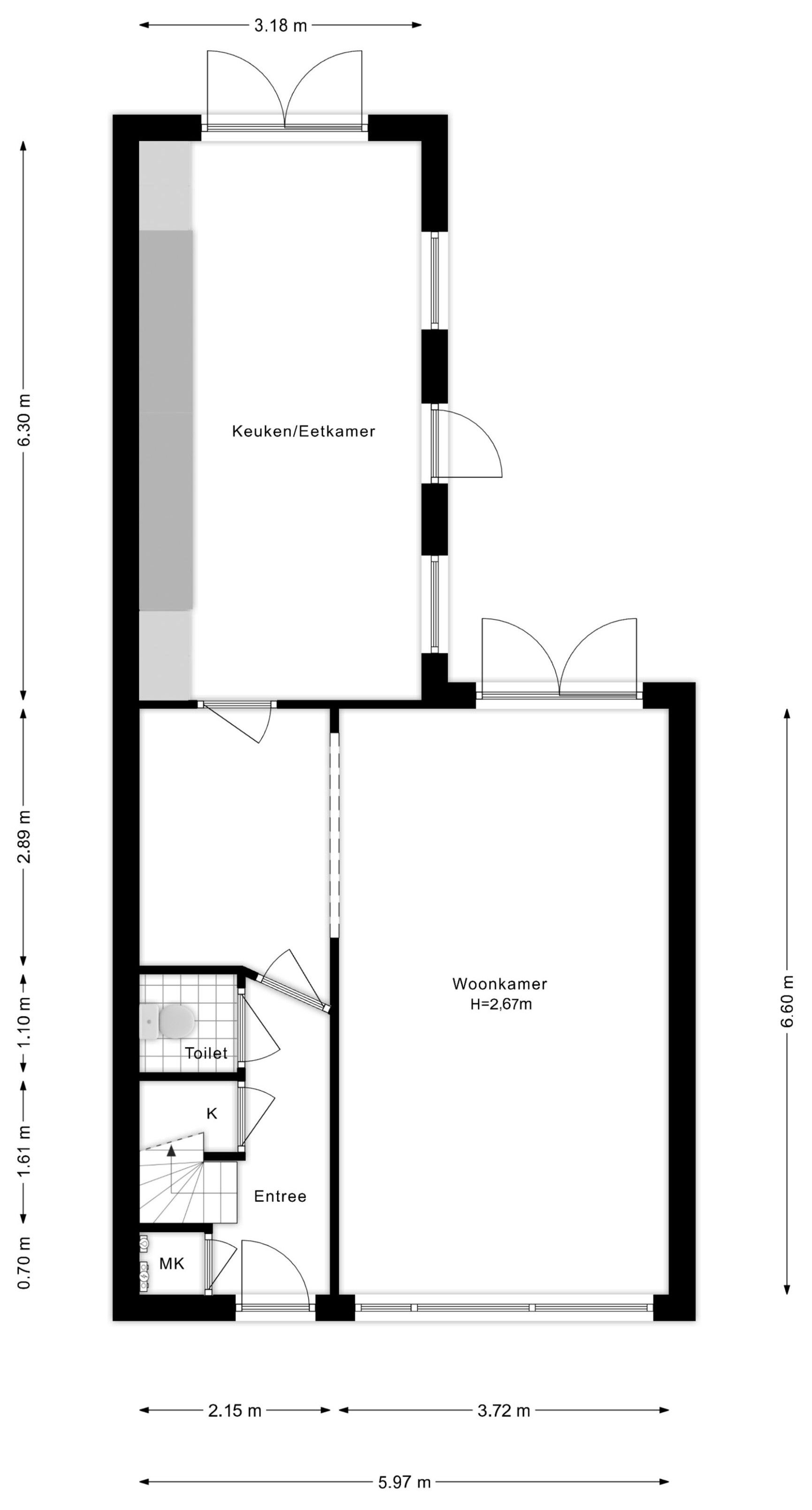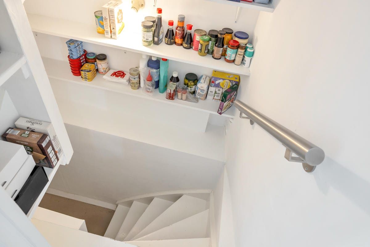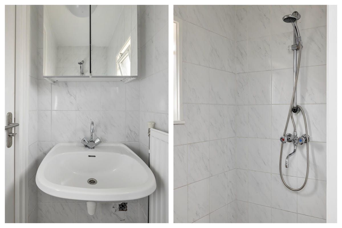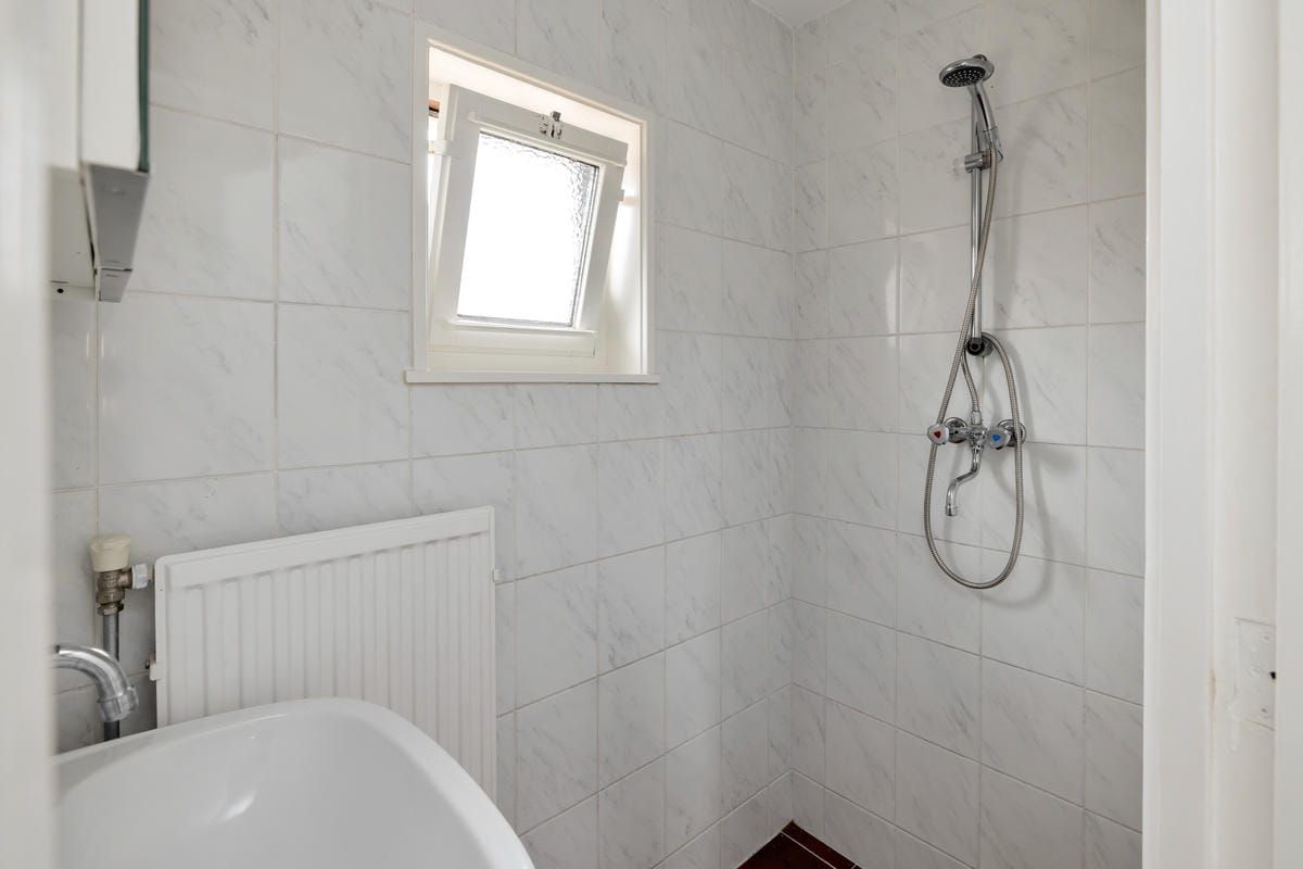 Begane grond: Hal met garderobe en moderne toiletruimte met zwevend toilet. Kelderkast, geïmpregneerd tegen optrekkend vocht. Doorzonwoonkamer met houten vloer en toegang tot de royale aanbouw. Hier bevindt zich de moderne woonkeuken, voorzien van combimagnetron, stoomoven, koel-vriescombinatie, vaatwasser, afzuigkap, close-in boiler en wasmachineaansluiting. De gasaansluiting is aanwezig, maar er is geen gasfornuis geplaatst. Openslaande deuren geven toegang tot de diepe achtertuin met regenton, tuinbrede schuur (dak vernieuwd) en achterom.