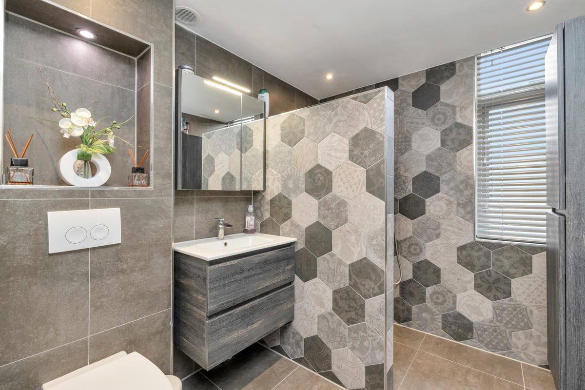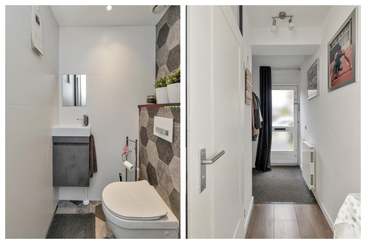 De woning is netjes afgewerkt en praktisch ingedeeld. U komt binnen via de entree met garderobe en meterkast. Het toilet is in 2022 vernieuwd en uitgevoerd met hexagon tegels, een zwevend toilet en fonteintje.