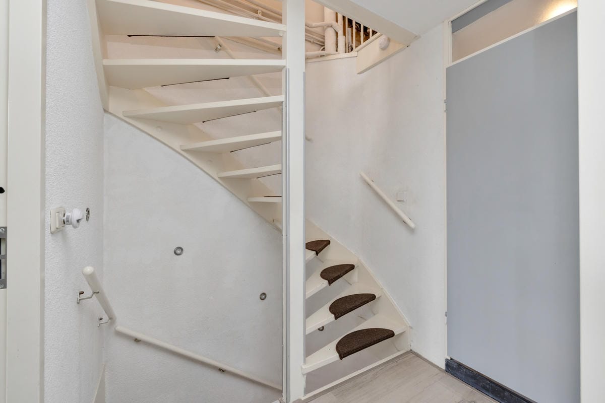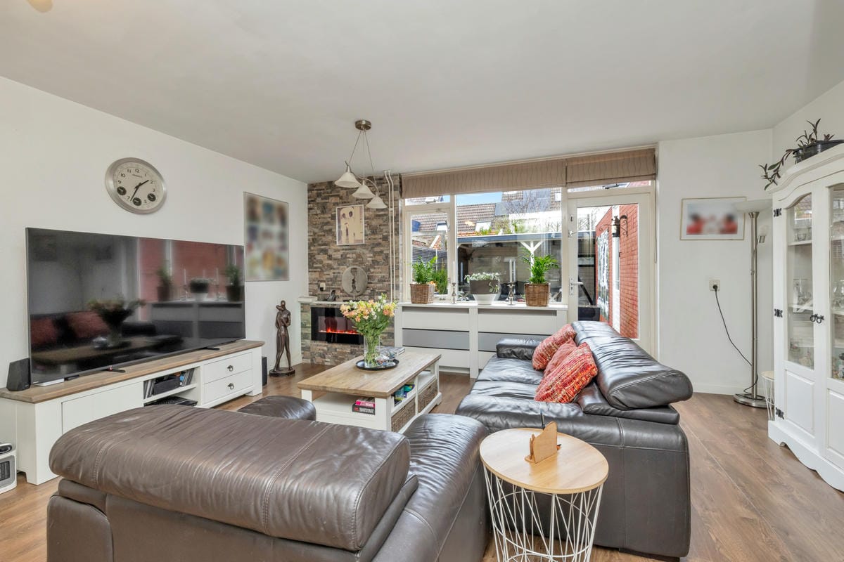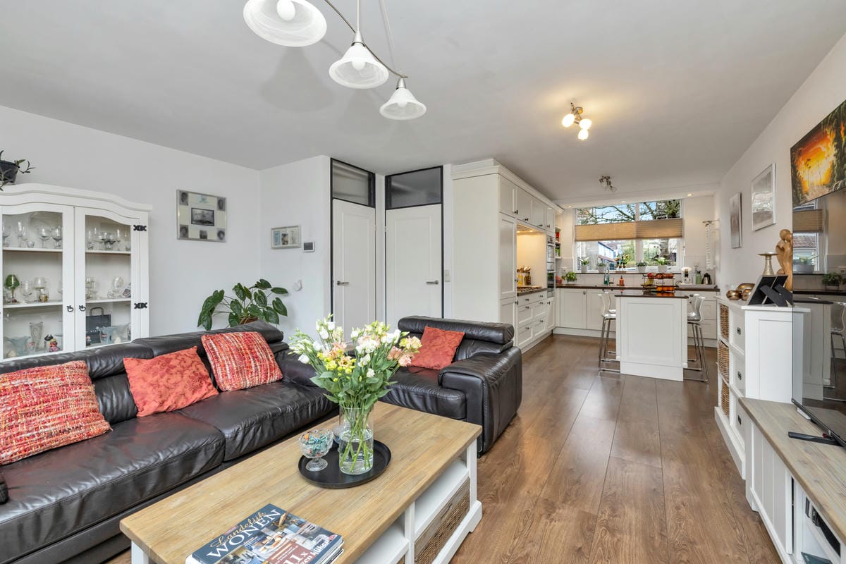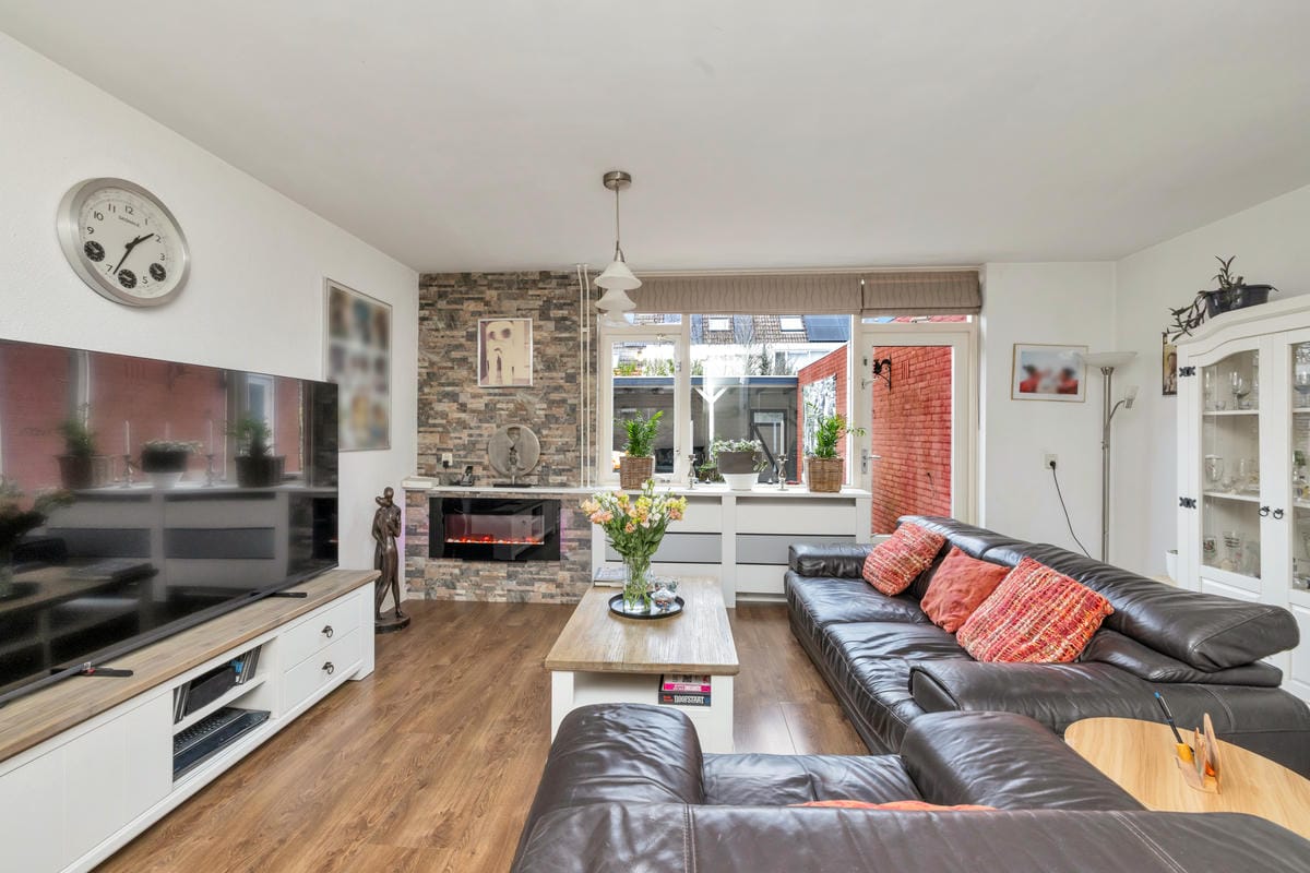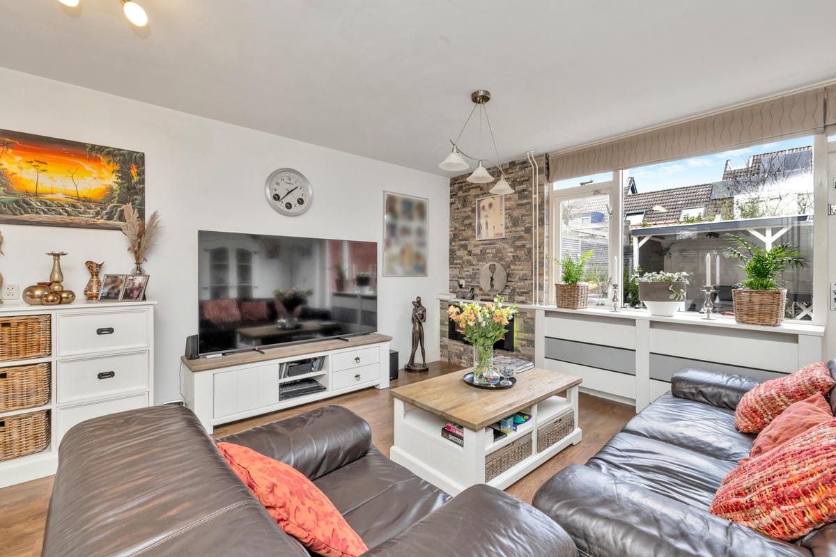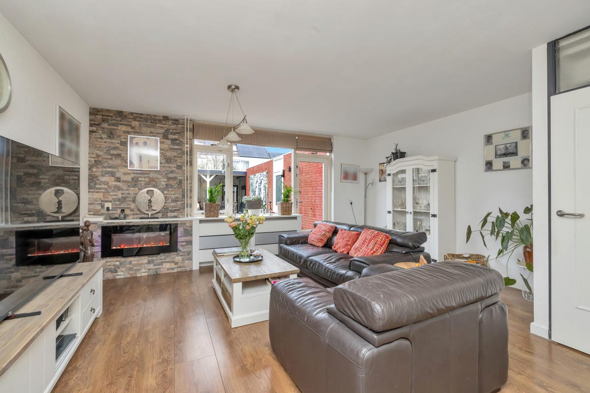 De woonkamer is sfeervol en licht, met een laminaatvloer in brede planken en spachtelputz wanden. De radiatoren zijn strak weggewerkt met radiatorbekleding en de elektrische haard zorgt voor extra warmte en sfeer. Onder de trap bevindt zich een handige trapkast voor provisie en bergruimte.