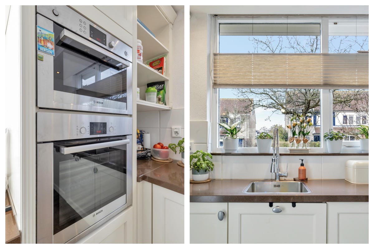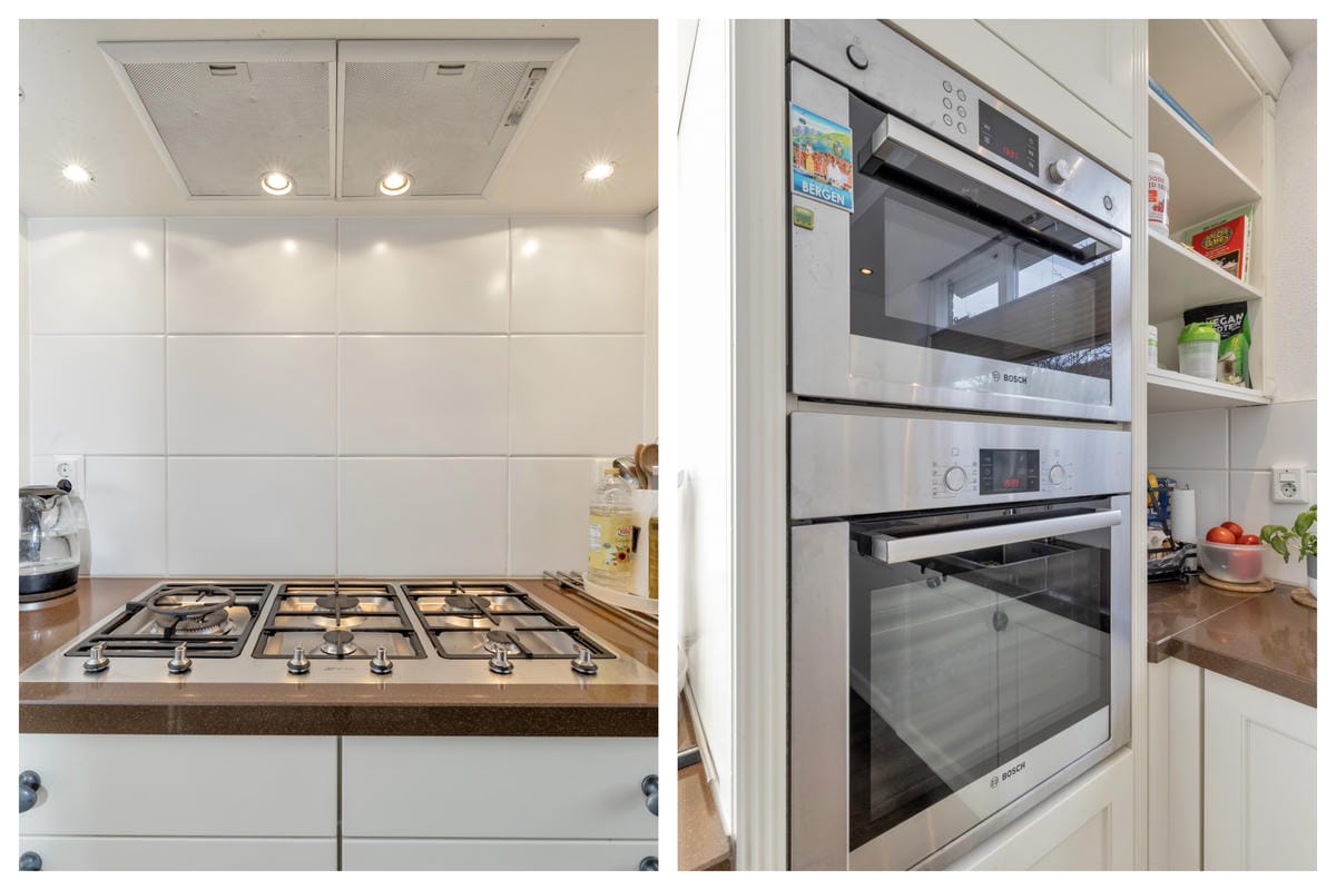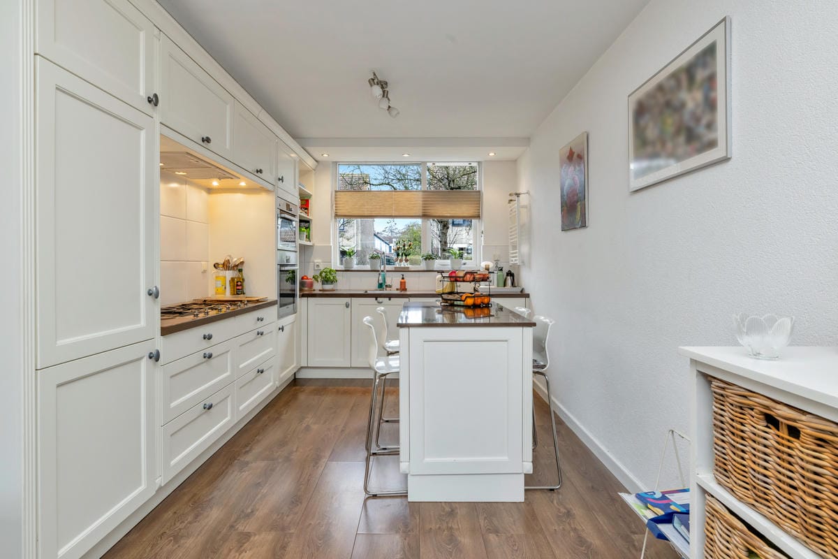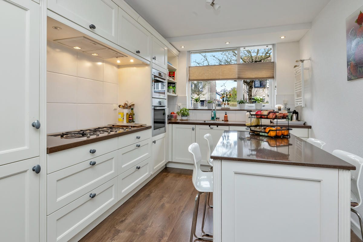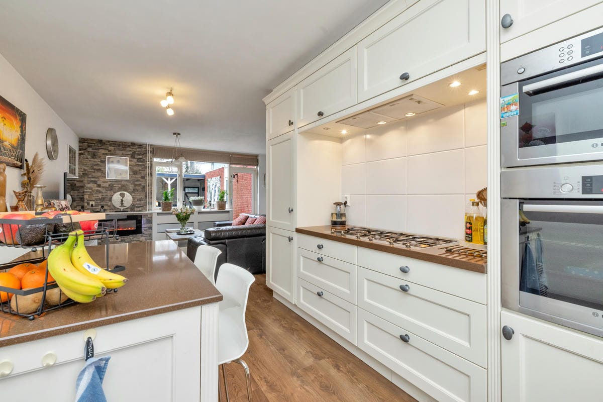 Aan de voorijde van de woning ligt de crèmekleurige hoekkeuken. Het kookeiland met bar is desgewenst eenvoudig te verwijderen, waarbij de vloer netjes doorloopt. Het bruine marmeren aanrechtblad geeft de keuken een warme uitstraling. De keuken is voorzien van een 4 pits gasfornuis met wokbrander, vaatwasser, inbouwmagnetron en oven.