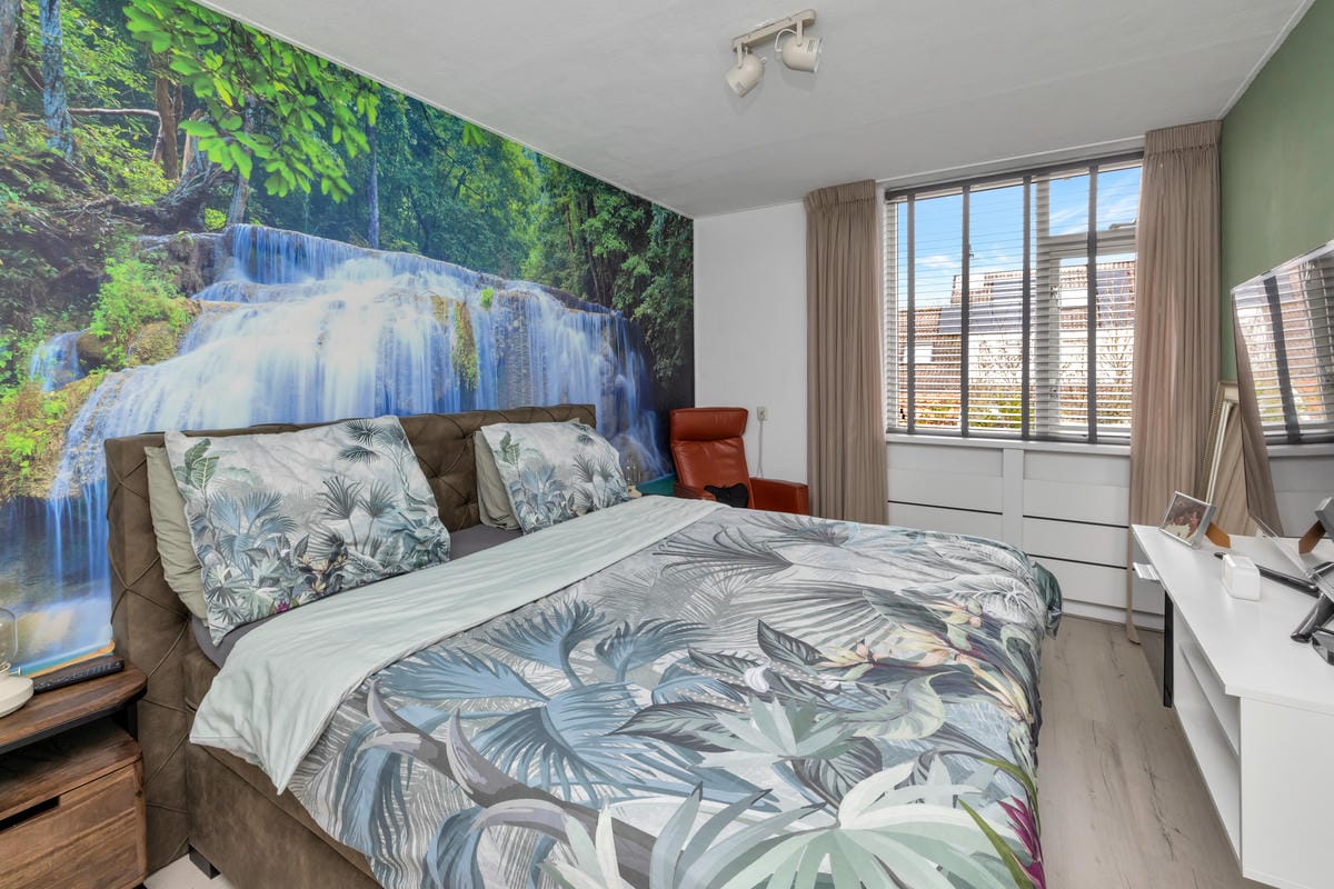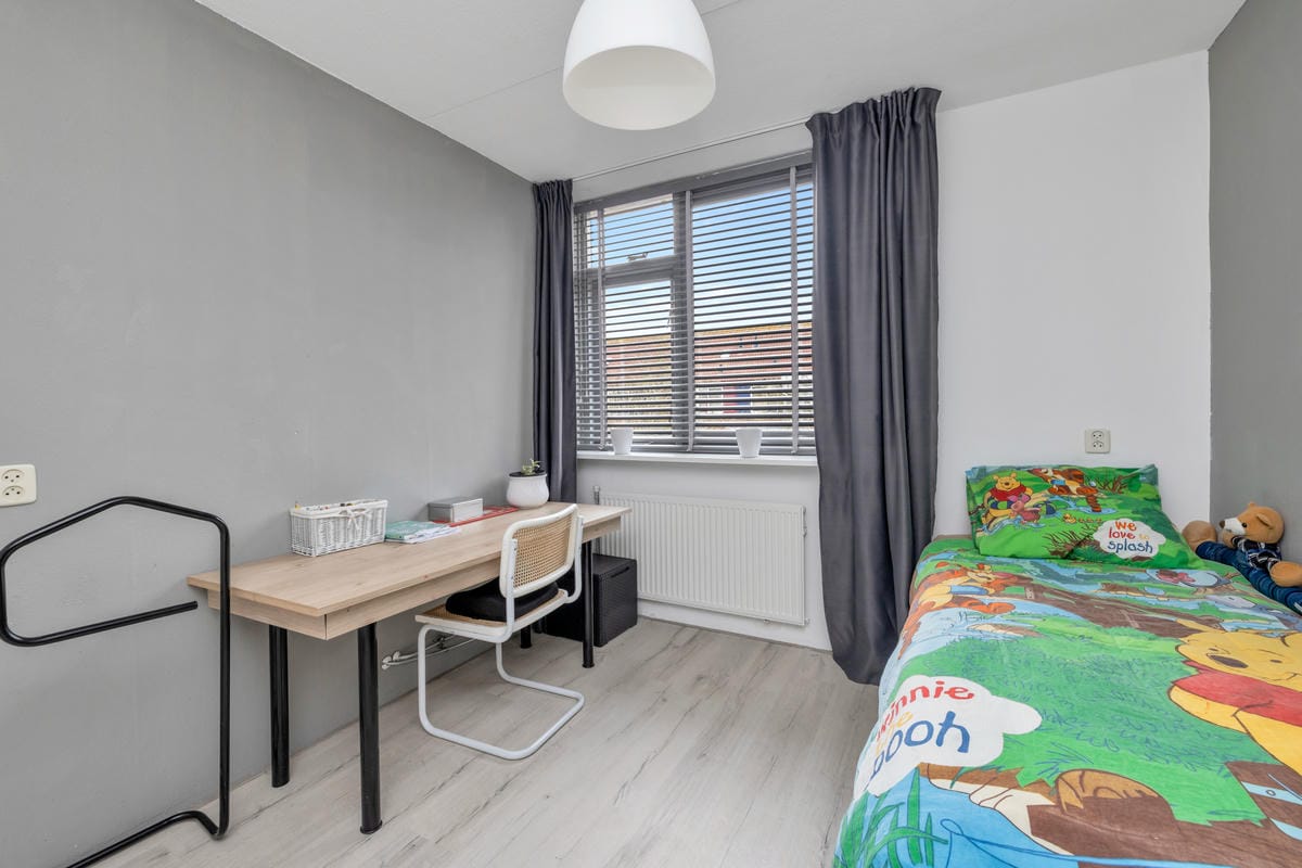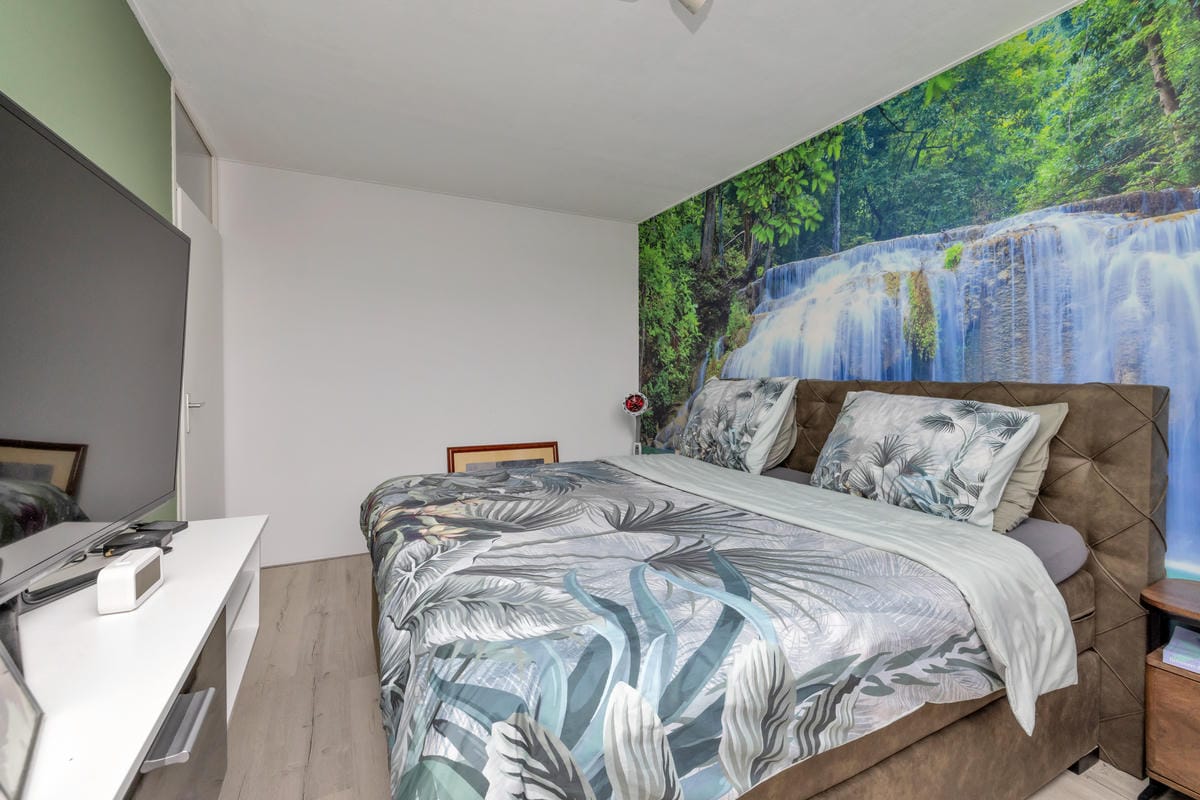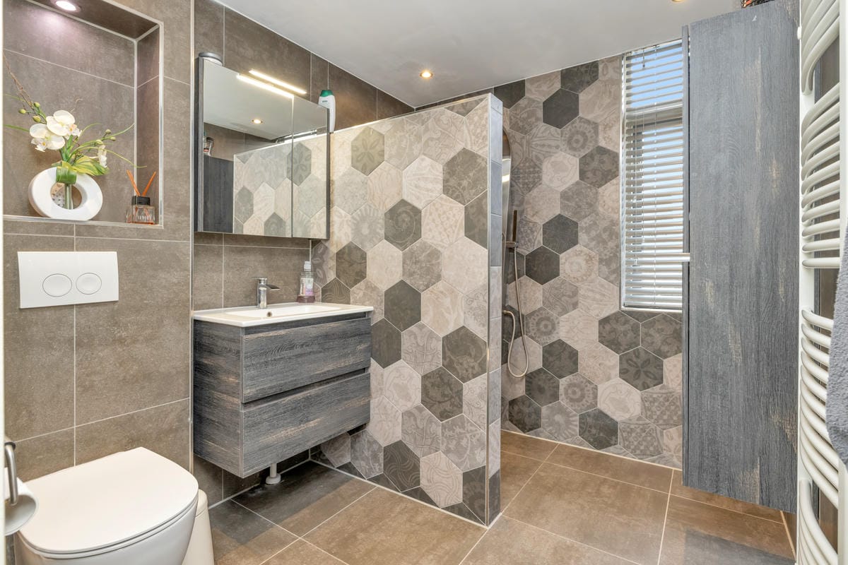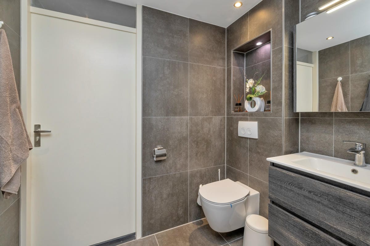 Op de verdieping bevinden zich drie slaapkamers en een moderne badkamer uit 2022. De badkamer is uitgevoerd met een inloopdouche met massagestralen, een verlichte nis, wastafel, toilet, spiegelkast en een verlaagd plafond met inbouwspots. De trap naar boven is bekleed met laminaat en voorzien van spotjes in de wand, wat zorgt voor een verzorgde uitstraling. De laminaatvloer loopt door over de gehele verdieping.