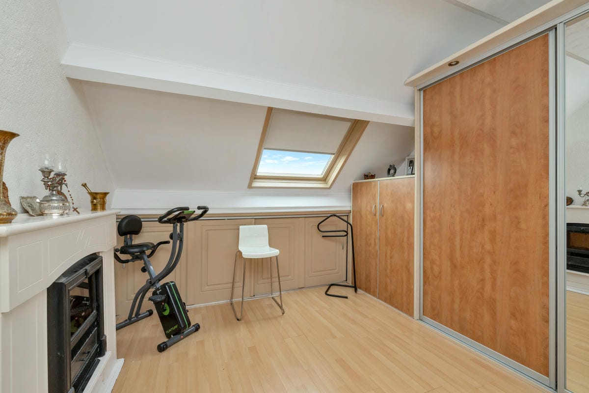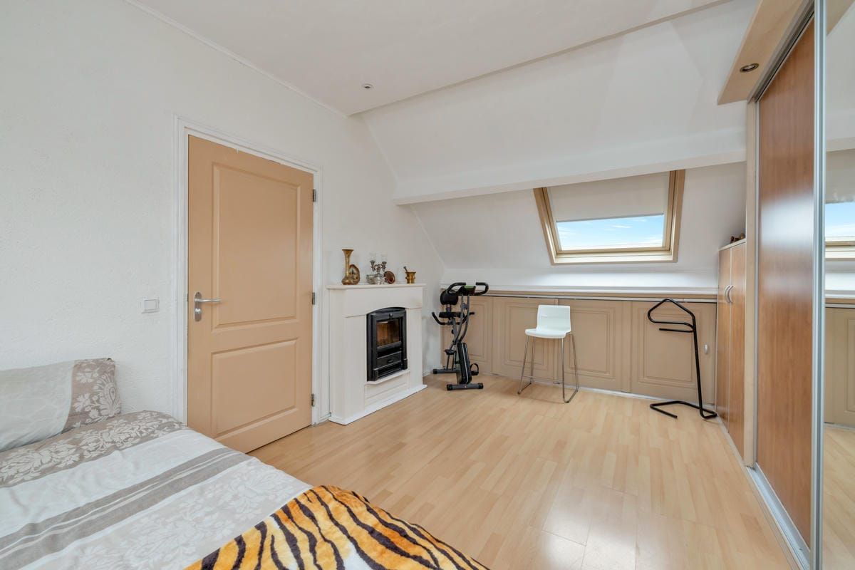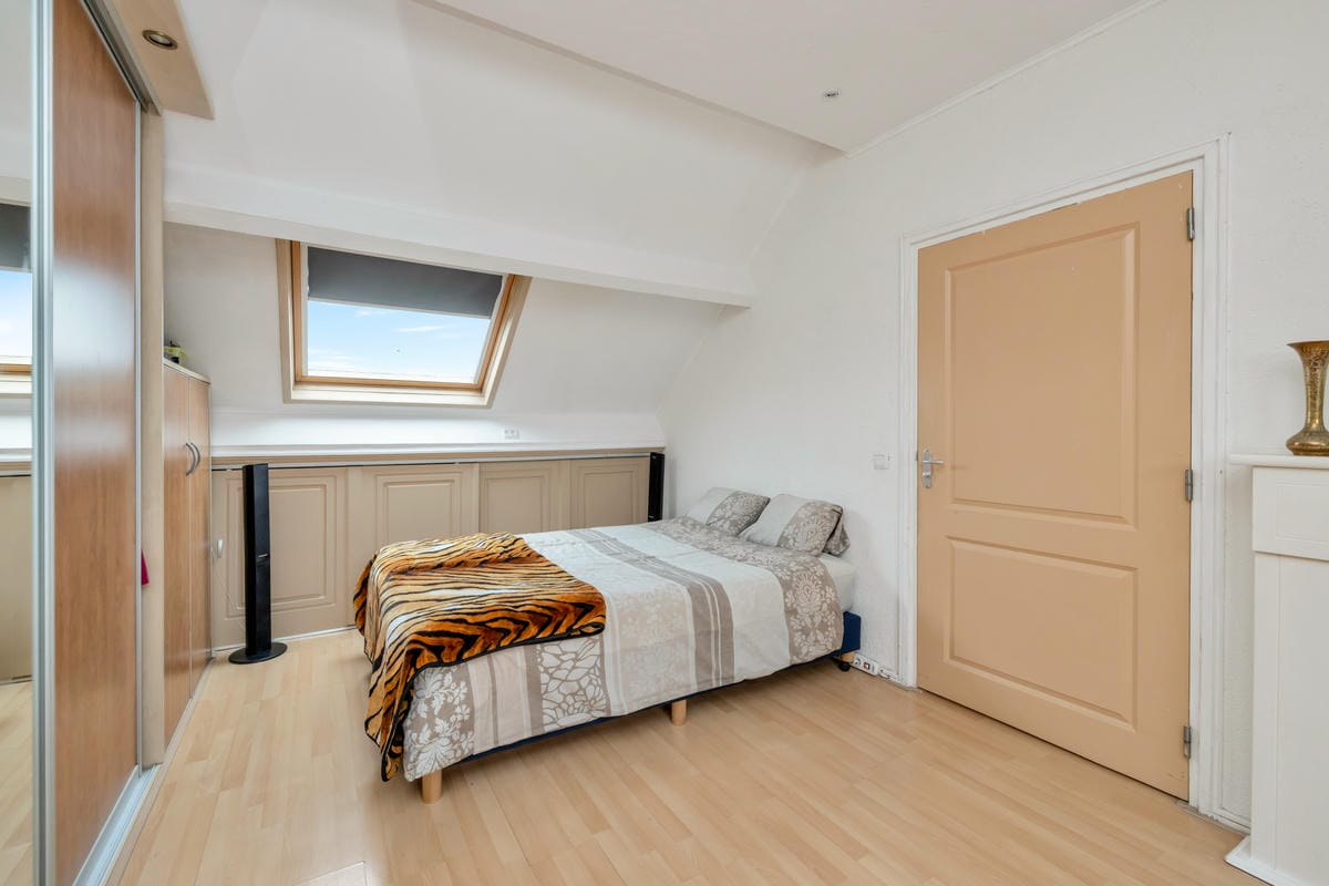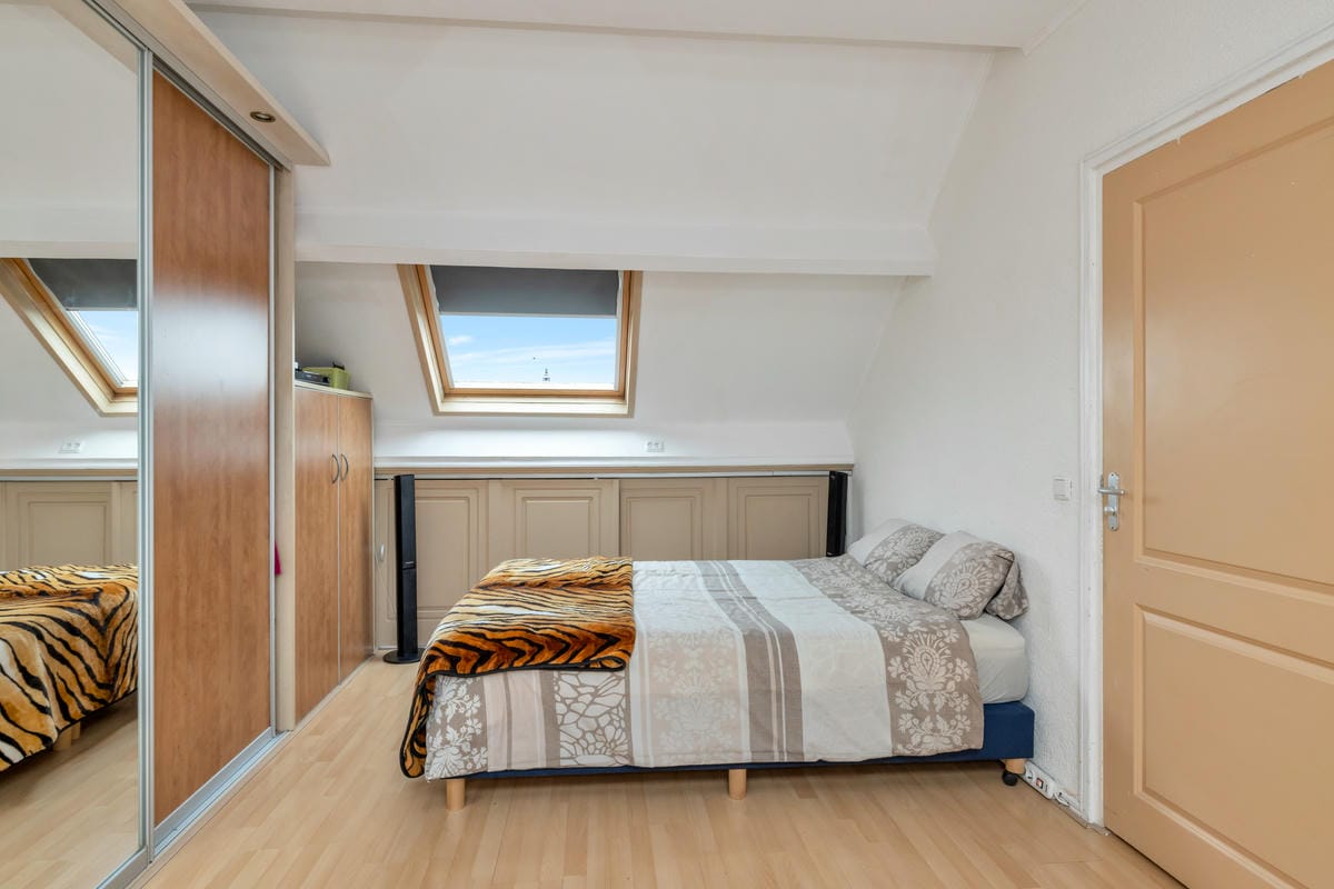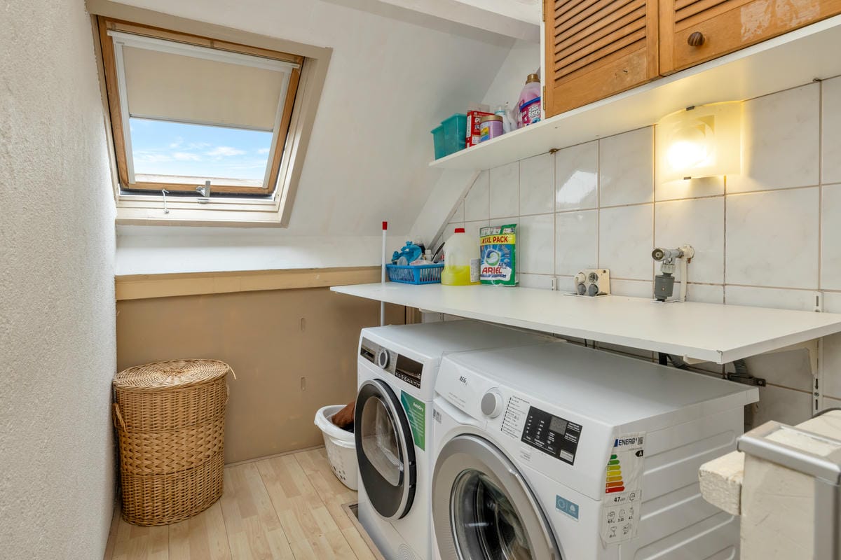 De tweede verdieping biedt een voorzolder met wasmachine en drogeraansluiting, de cv opstelling, knieschotten en een dakraam. De vierde slaapkamer is ruim en beschikt over twee dakramen, een vaste kastenwand en extra bergruimte achter de knieschotten. Tevens is er een praktische bergvliering aanwezig.