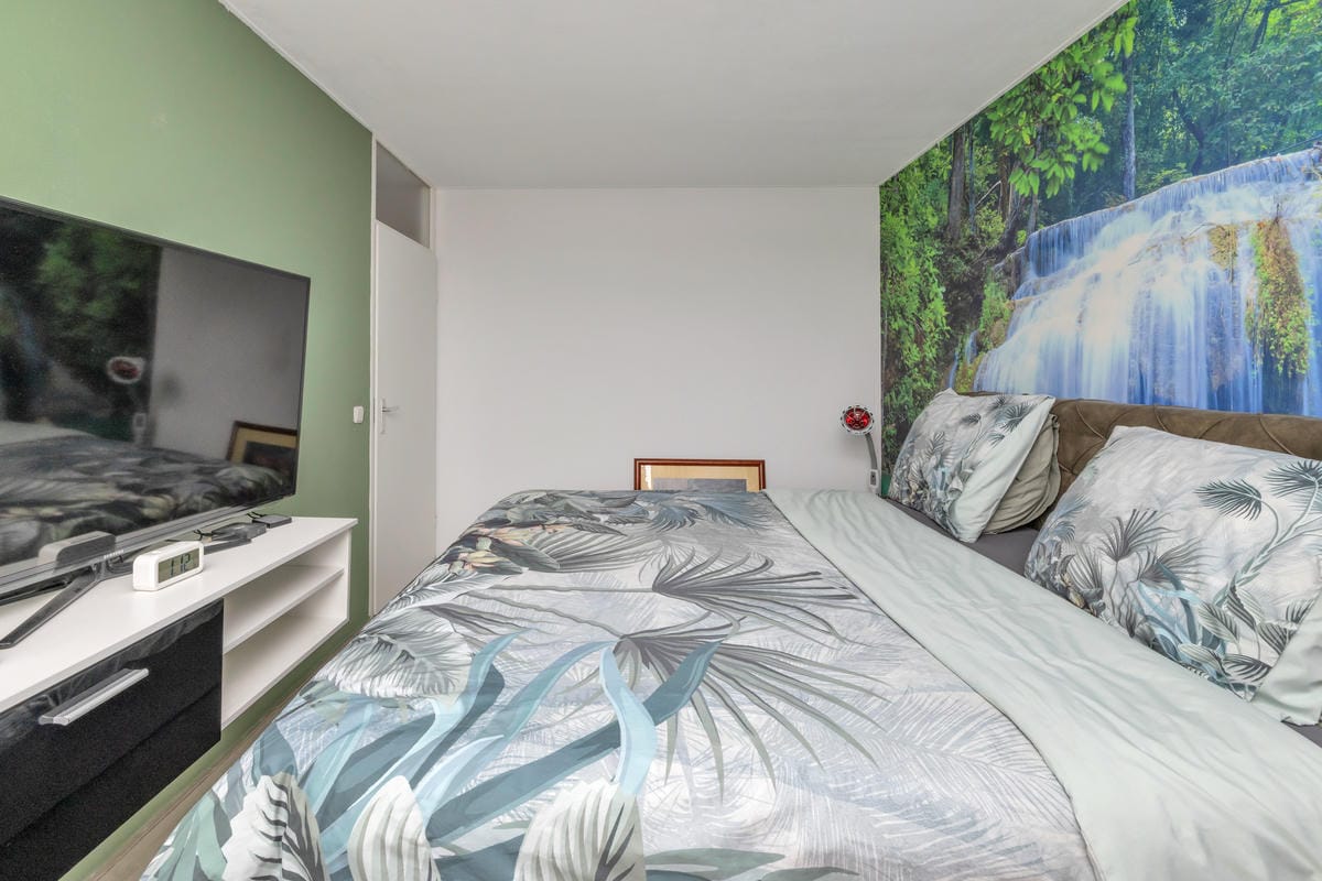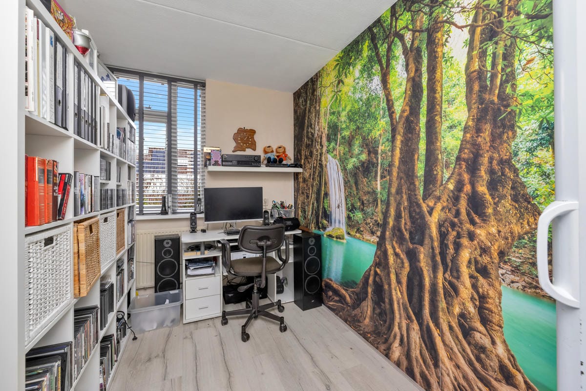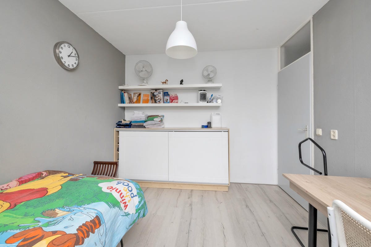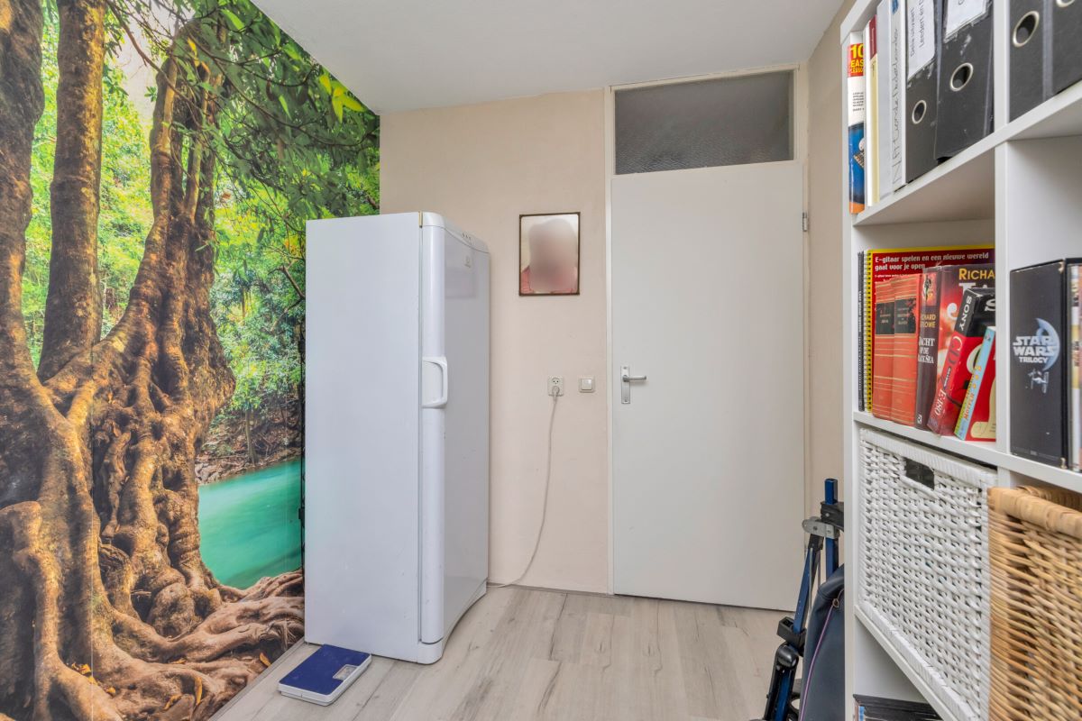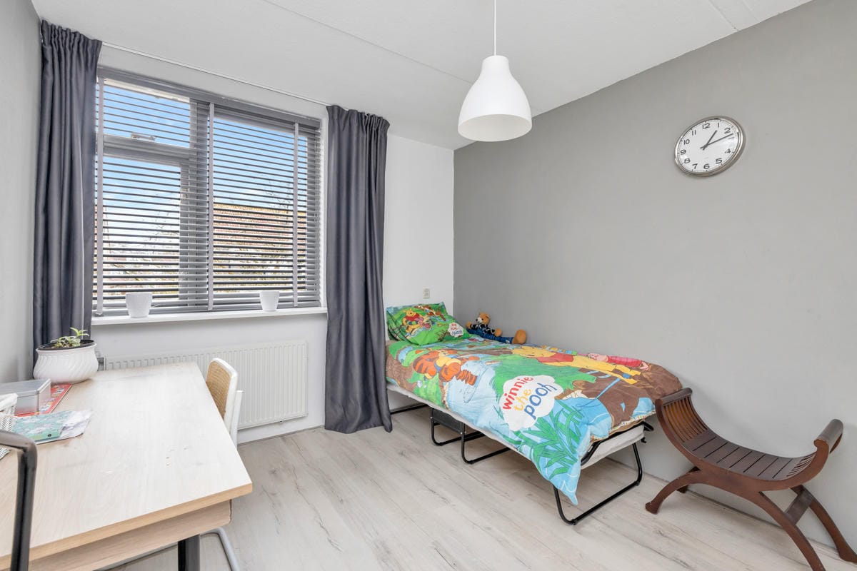 De tweede verdieping biedt een voorzolder met wasmachine en drogeraansluiting, de cv opstelling, knieschotten en een dakraam. De vierde slaapkamer is ruim en beschikt over twee dakramen, een vaste kastenwand en extra bergruimte achter de knieschotten. Tevens is er een praktische bergvliering aanwezig.
