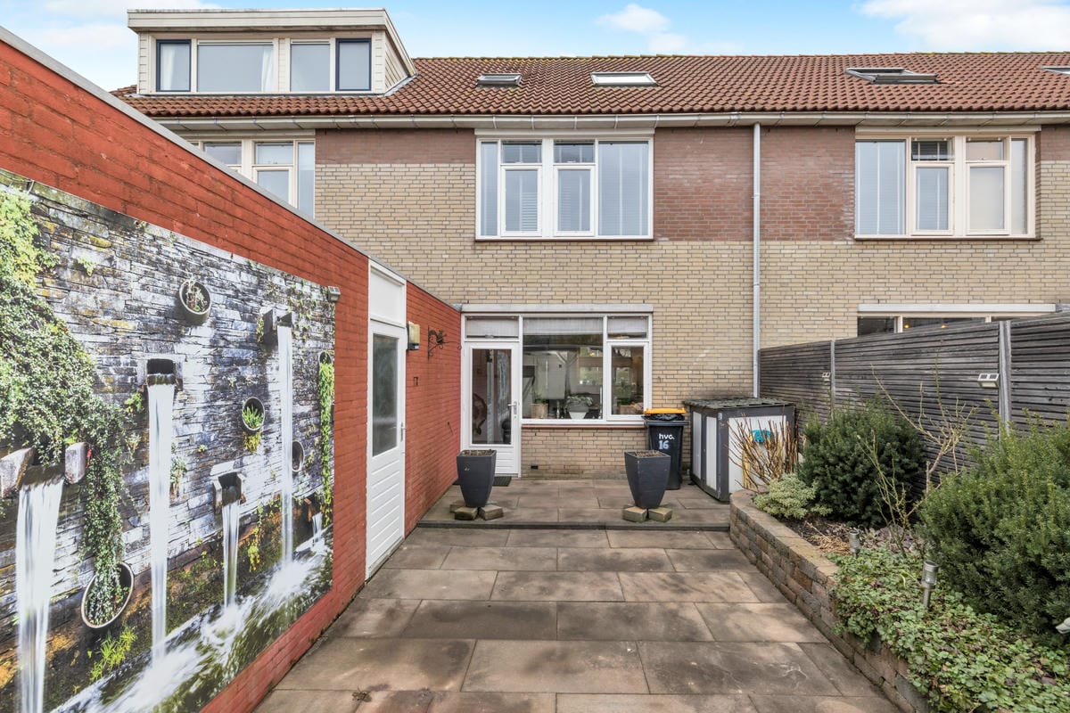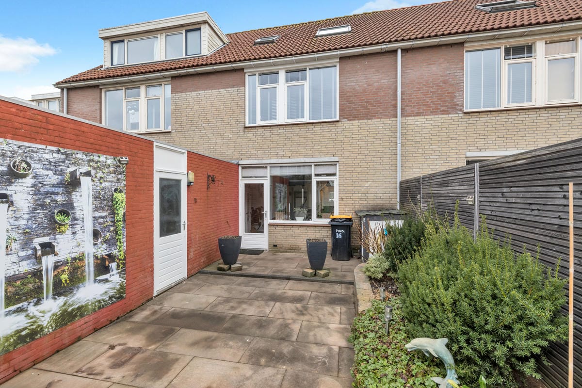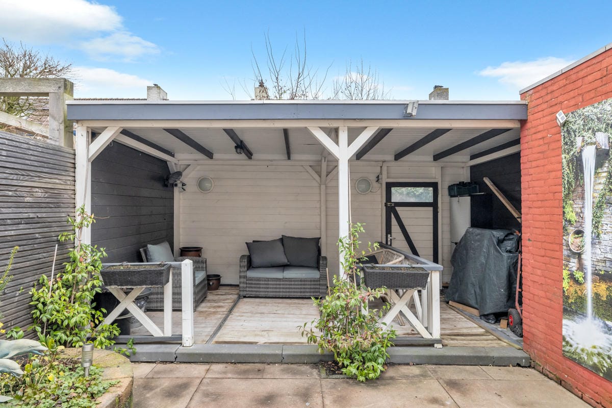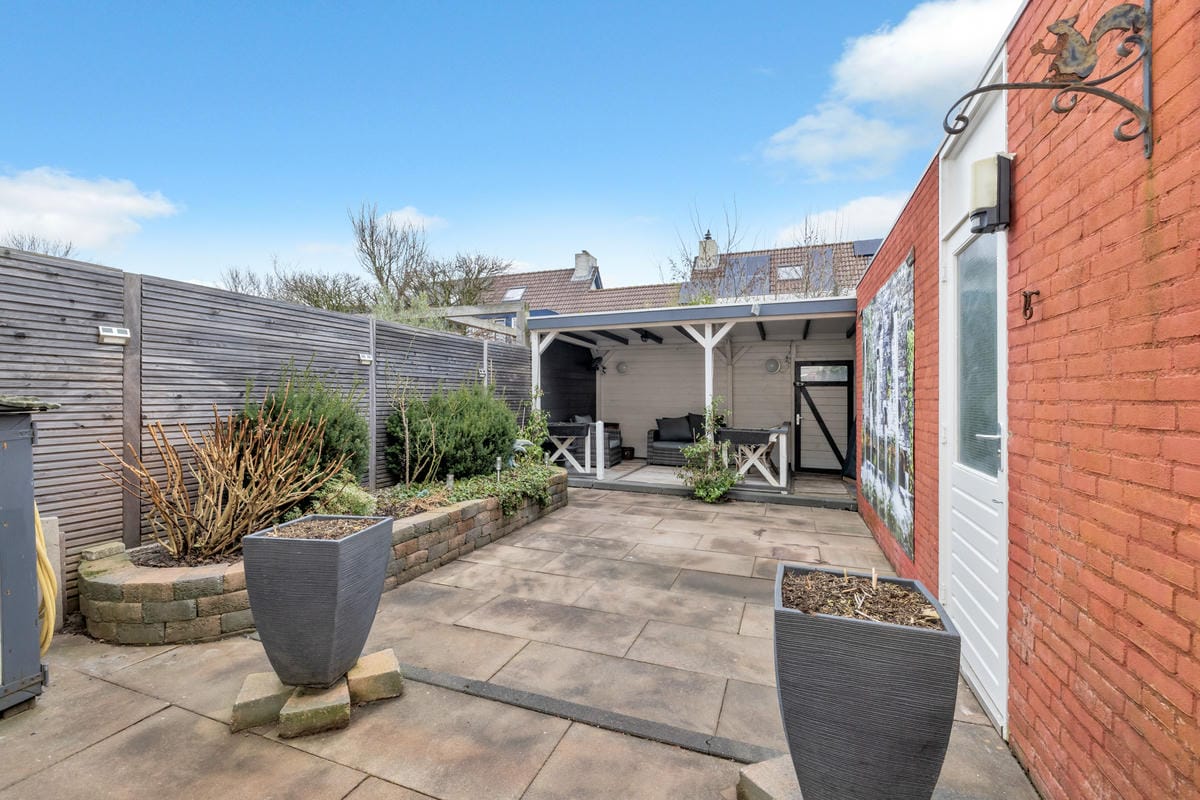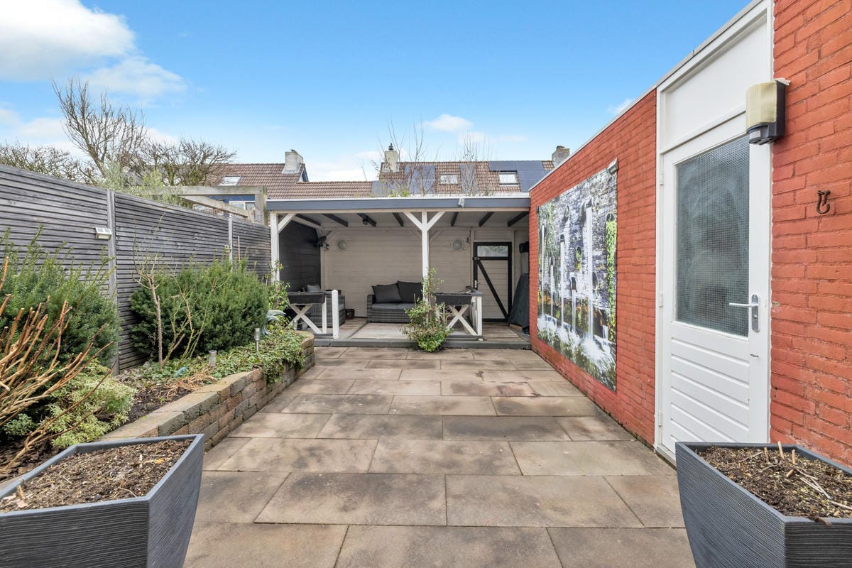 De achtertuin is gelegen op het noordoosten en beschikt over een overkapping waar u beschut kunt zitten. Daarnaast is er een eigen achterom en een vrijstaande berging met elektra.