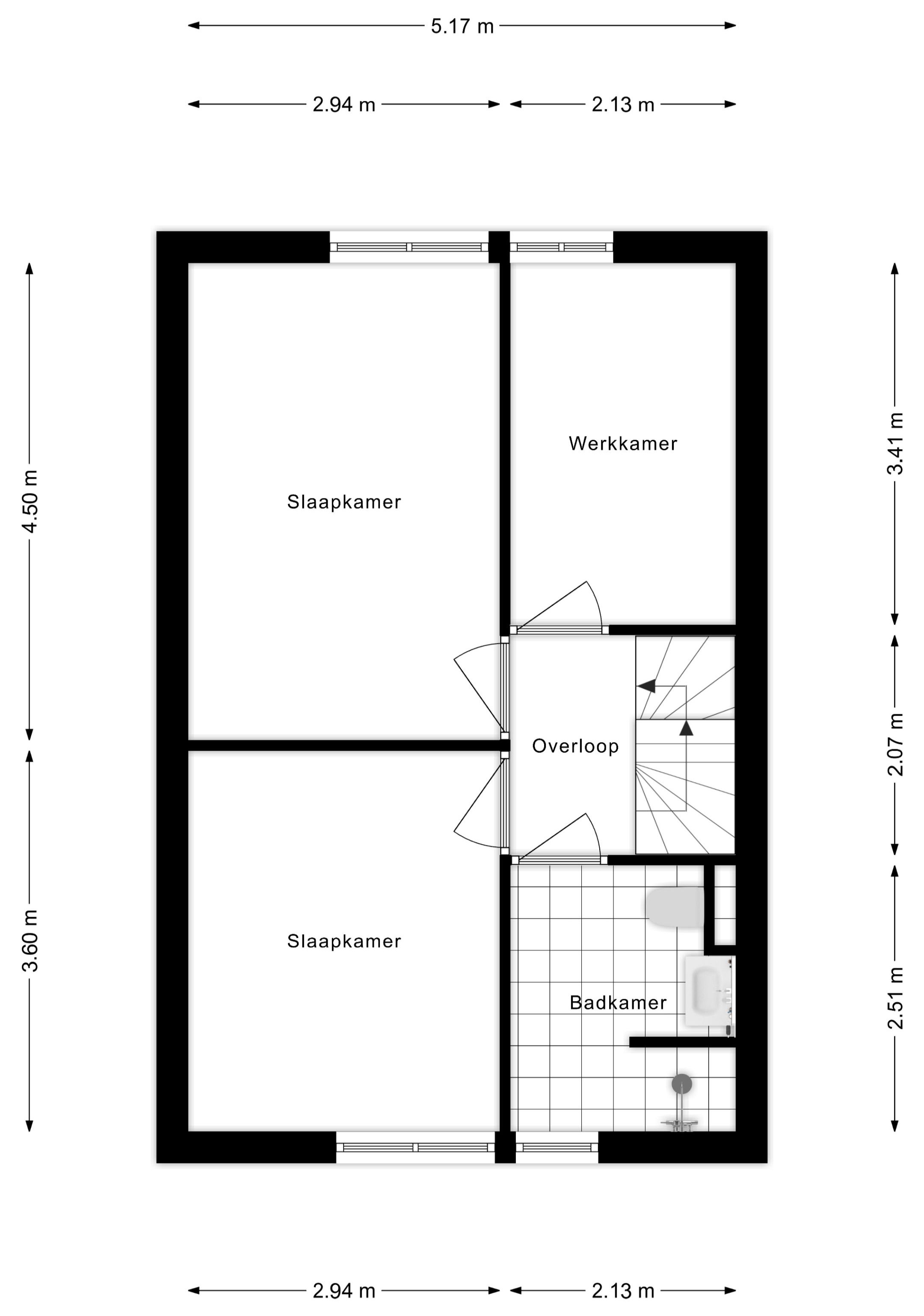 Eerste verdieping: overloop, drie slaapkamers, badkamer.