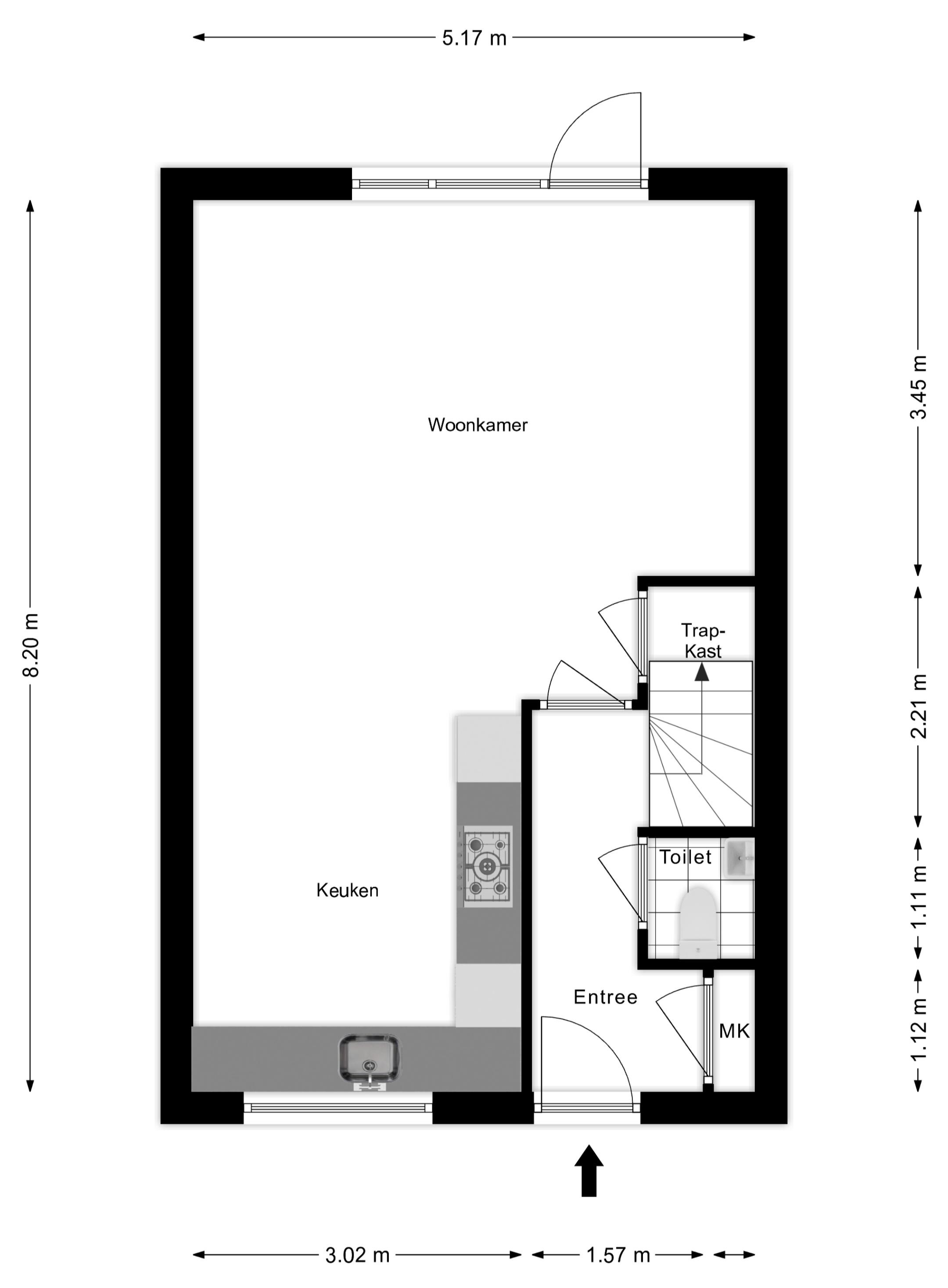 Begane grond: entree, hal met toilet, woonkamer met trapkast, open keuken, achtertuin met overkapping, berging en achterom