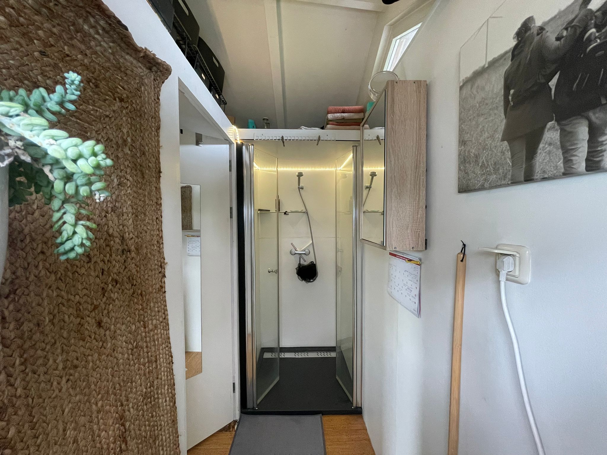- De douchecel is bekleed met Trespa en beschikt over een waterbesparende douchekop.