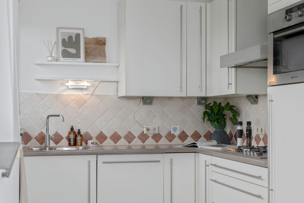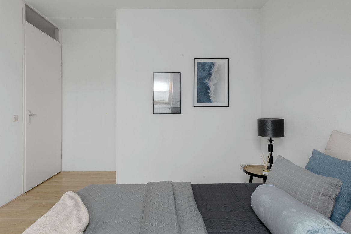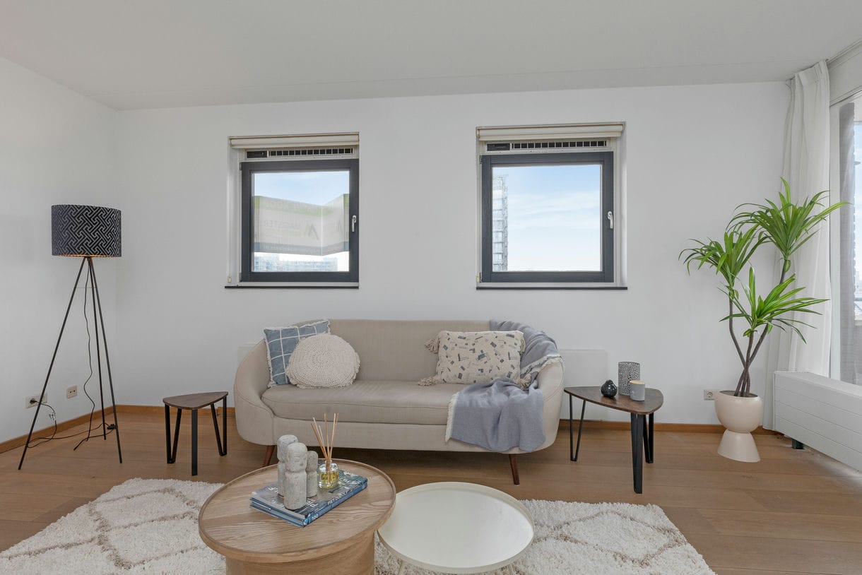 1e woonlaag: Entree complex via de centrale ingang op de begane grond voorzien van videophone of via de parkeerkelder. Entree, hal met daarin toilet, meterkast, provisieruimte en houten, open trap naar de 4e verdieping. Lichte L-vormige woonkamer met parketvloer en schuifpui naar het balkon op het noordwesten. De semi open keuken is voorzien van een gasfornuis, afzuigkap, combimagnetron, koel-vries combinatie en vaatwasser.